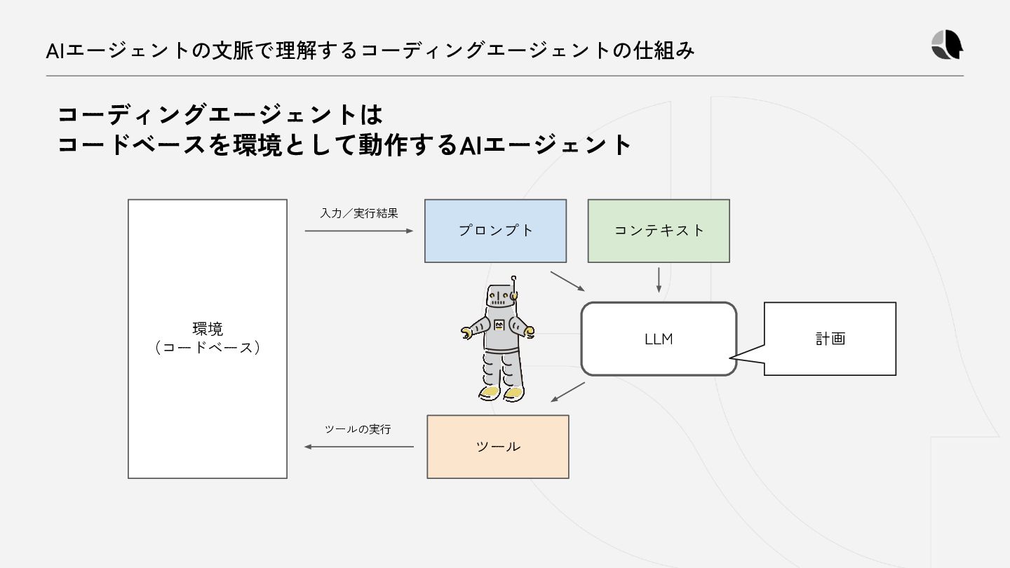 NotebookRead NotebookEdit Task TodoWrite WebFetch WebSearch コンテキスト ファイル操作 Jupyter操作 タスク管理 Web検索 どれにしようかな キーポイント コーディングエージェントとは、知覚した情報をもとに、これらのツールを選択し続けるシステムと言えます。