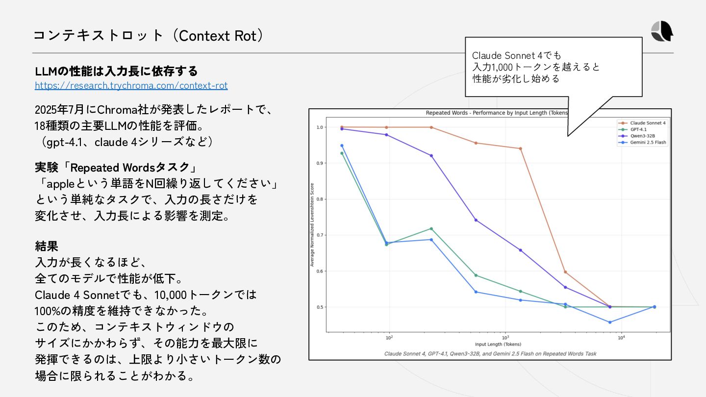 (gpt-4.1、claude 4シリーズなど) 実験「Repeated Wordsタスク」 「appleという単語をN回繰り返してください」 という単純なタスクで、入力の長さだけを 変化させ、入力長による影響を測定。 https://research.trychroma.com/context-rot 結果 入力が長くなるほど、 全てのモデルで性能が低下。 Claude 4 Sonnetでも、10,000トークンでは 100%の精度を維持できなかった。 このため、コンテキストウィンドウの サイズにかかわらず、その能力を最大限に 発揮できるのは、上限より小さいトークン数の 場合に限られることがわかる。