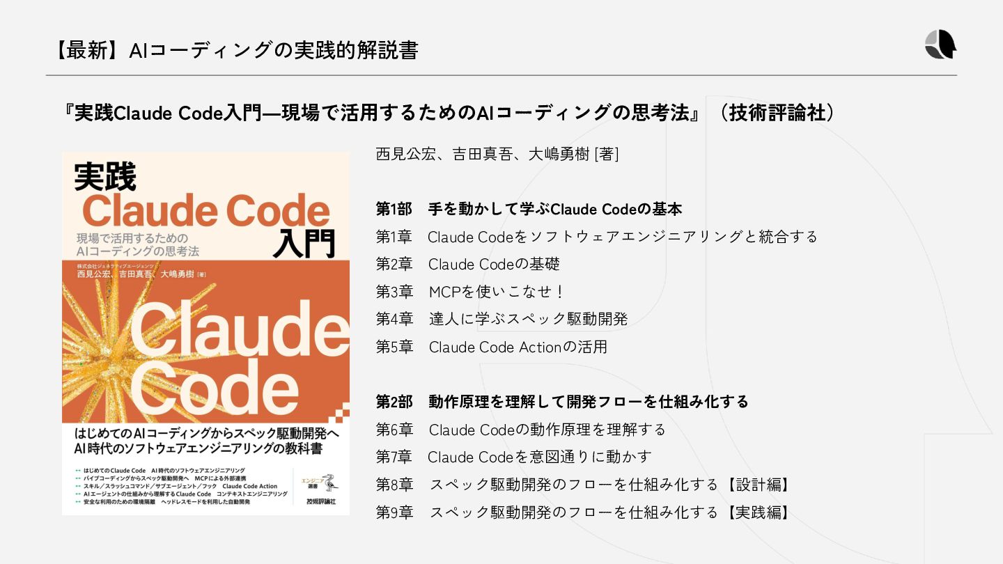 13. 【最新】AIコーディングの実践的解説書 『実践Claude Code入門―現場で活用するためのAIコーディングの思考法』(技術評論社) 西見公宏、吉田真吾、大嶋勇樹 [著] 第1部 手を動かして学ぶClaude Codeの基本 第1章 Claude Codeをソフトウェアエンジニアリングと統合する 第2章 Claude