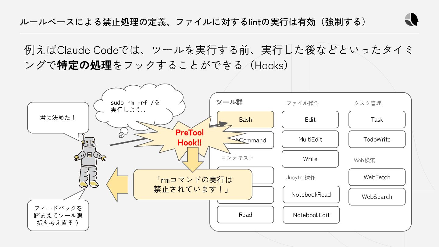Edit MultiEdit Write NotebookRead NotebookEdit Task TodoWrite WebFetch WebSearch コンテキスト ファイル操作 Jupyter操作 タスク管理 Web検索 君に決めた! sudo rm -rf /を 実行しよう... PreTool Hook!! 「rmコマンドの実行は 禁止されています!」 フィードバックを 踏まえてツール選 択を考え直そう