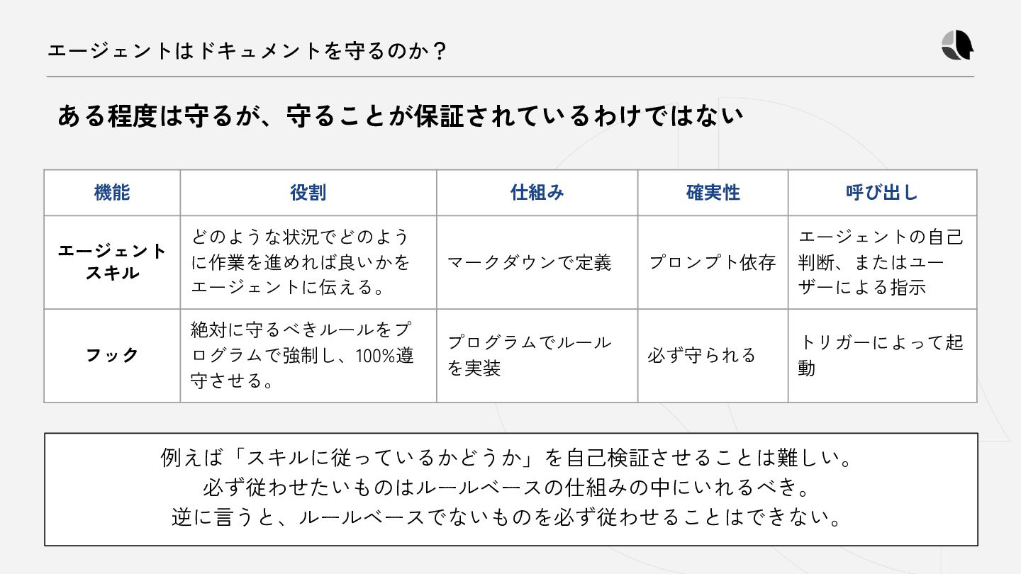 に作業を進めれば良いかを エージェントに伝える。 マークダウンで定義 プロンプト依存 エージェントの自己 判断、またはユー ザーによる指示 フック 絶対に守るべきルールをプ ログラムで強制し、100%遵 守させる。 プログラムでルール を実装 必ず守られる トリガーによって起 動 例えば「スキルに従っているかどうか」を自己検証させることは難しい。 必ず従わせたいものはルールベースの仕組みの中にいれるべき。 逆に言うと、ルールベースでないものを必ず従わせることはできない。