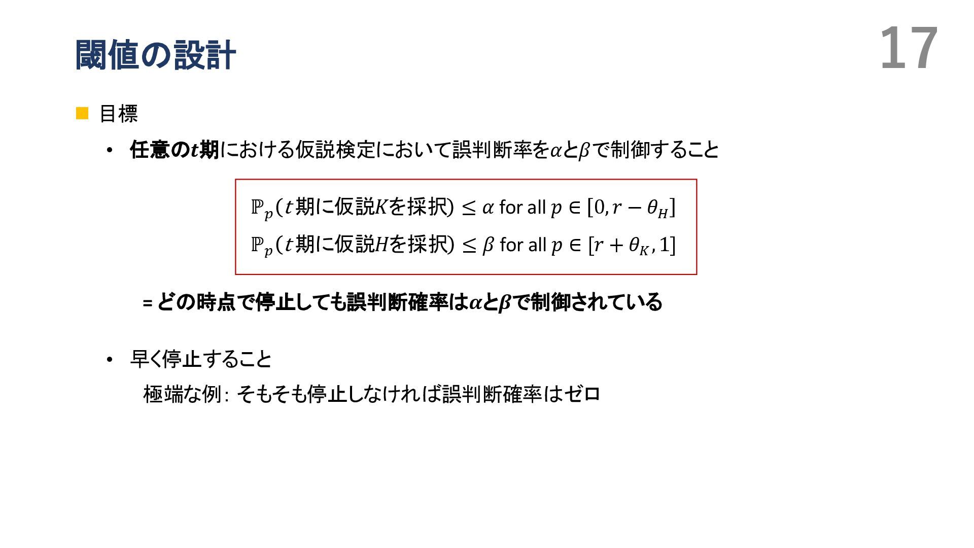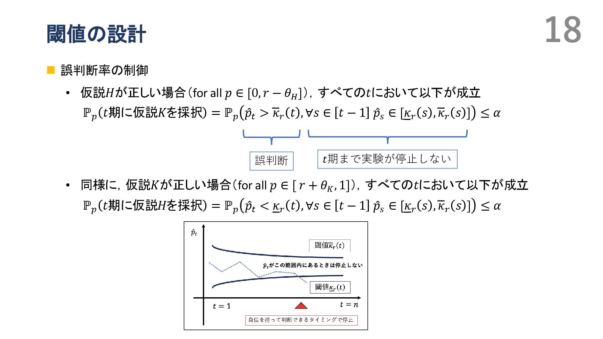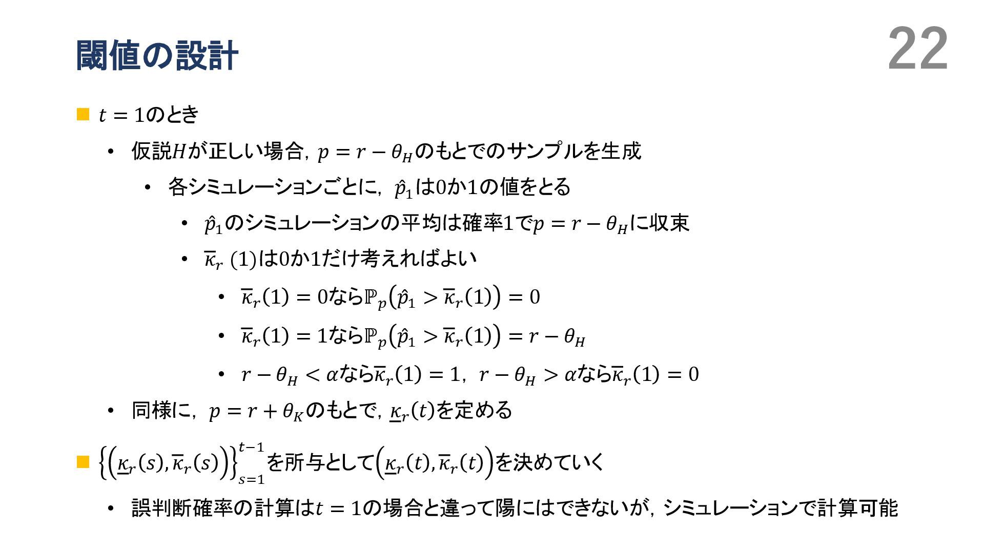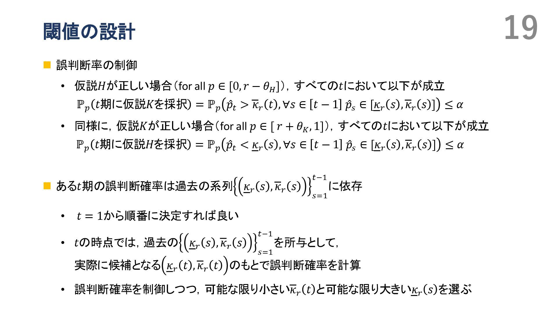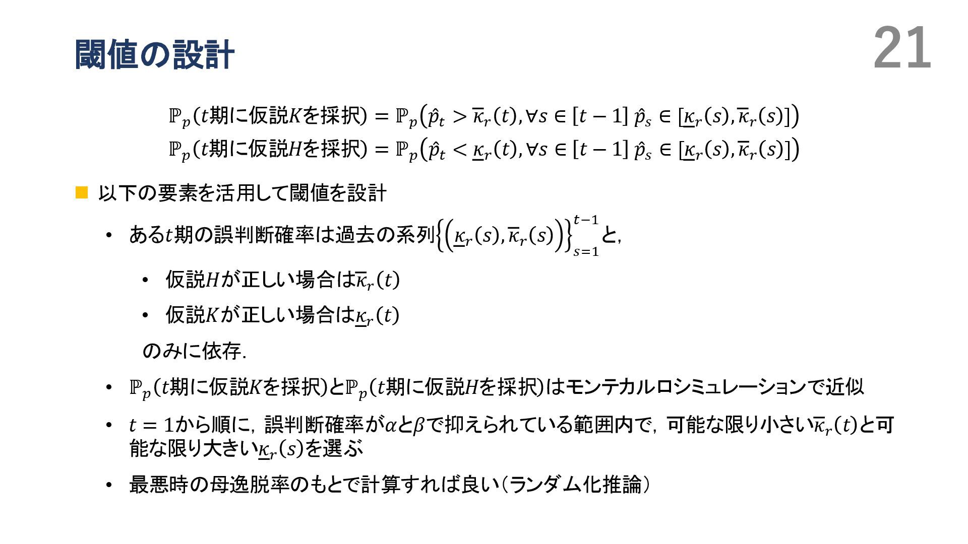 𝑟 − 𝜃𝐻 ]),すべての𝑡において以下が成立 ℙ𝑝 𝑡期に仮説𝐾を採択 = ℙ𝑝 Ƹ 𝑝𝑡 > 𝜅𝑟 𝑡 , ∀𝑠 ∈ 𝑡 − 1 Ƹ 𝑝𝑠 ∈ [𝜅𝑟 𝑠 , 𝜅𝑟 𝑠 ] ≤ 𝛼 • 同様に,仮説𝐾が正しい場合(for all 𝑝 ∈ [ 𝑟 + 𝜃𝐾 , 1]),すべての𝑡において以下が成立 ℙ𝑝 𝑡期に仮説𝐻を採択 = ℙ𝑝 Ƹ 𝑝𝑡 < 𝜅𝑟 𝑠 , ∀𝑠 ∈ 𝑡 − 1 Ƹ 𝑝𝑠 ∈ [𝜅𝑟 𝑠 , 𝜅𝑟 𝑠 ] ≤ 𝛼 ◼ ある𝑡期の誤判断確率は過去の系列 𝜅𝑟 𝑠 , 𝜅𝑟 𝑠 𝑠=1 𝑡−1 に依存 • 𝑡 = 1から順番に決定すれば良い • 𝑡の時点では,過去の 𝜅𝑟 𝑠 , 𝜅𝑟 𝑠 𝑠=1 𝑡−1 を所与として, 実際に候補となる 𝜅𝑟 𝑡 , 𝜅𝑟 𝑡 のもとで誤判断確率を計算 • 誤判断確率を制御しつつ,可能な限り小さい𝜅𝑟 𝑡 と可能な限り大きい𝜅𝑟 𝑠 を選ぶ