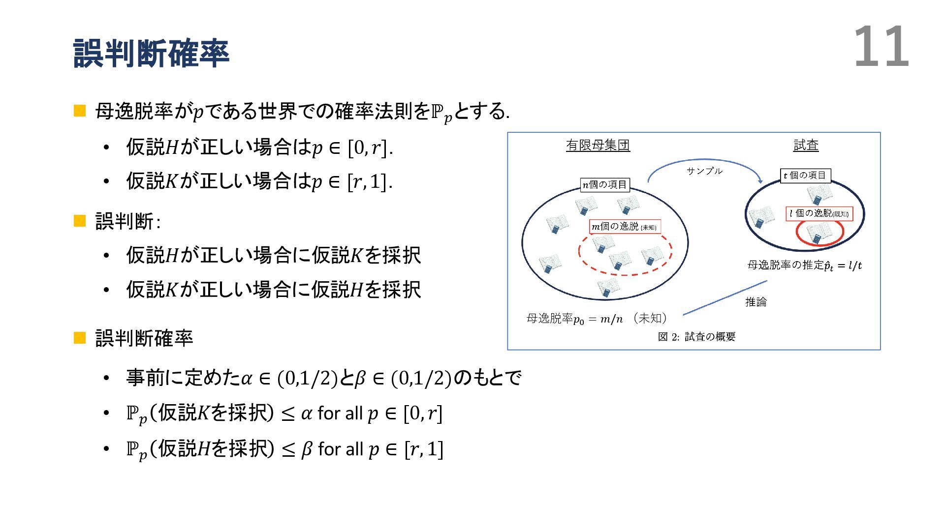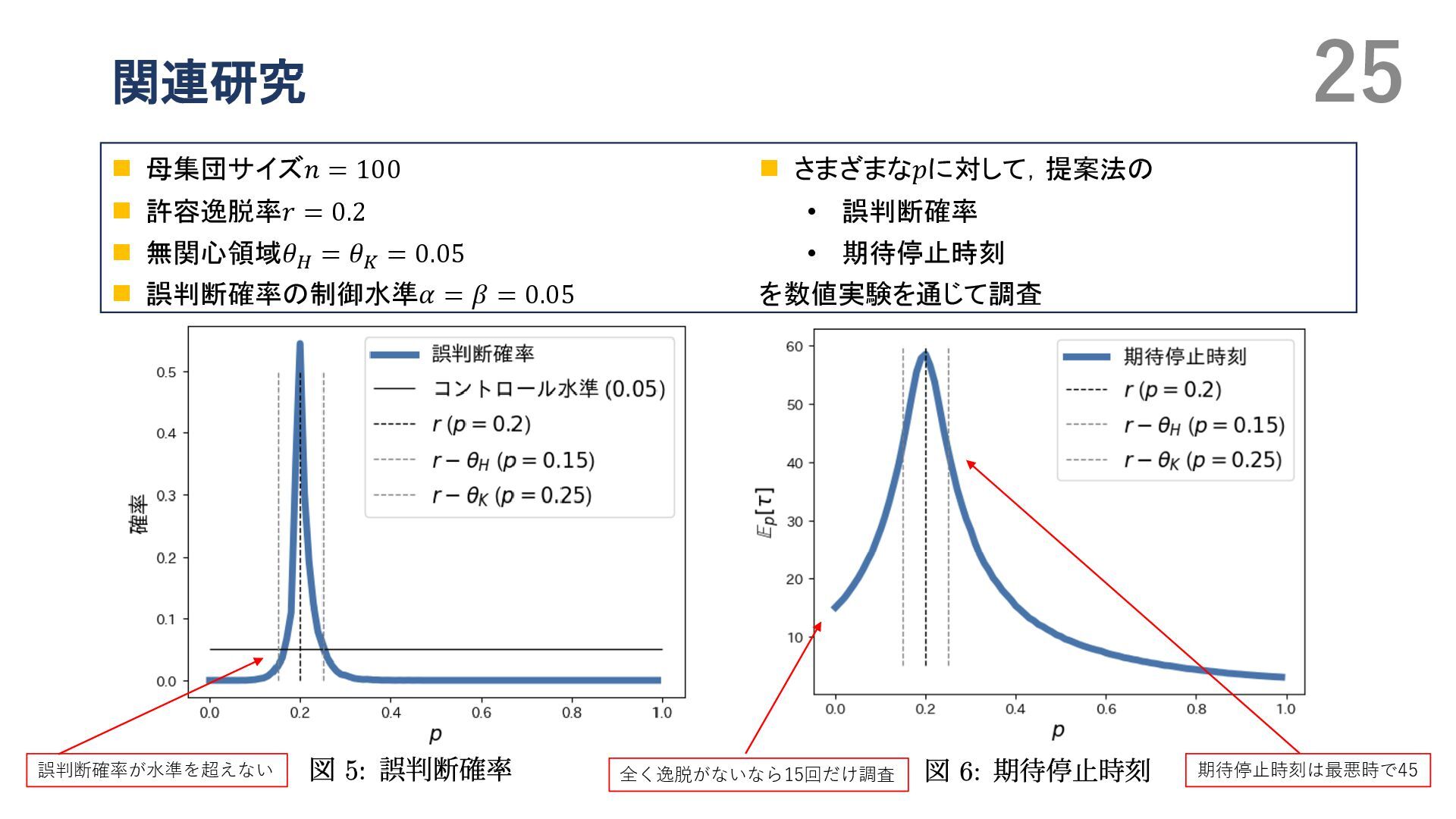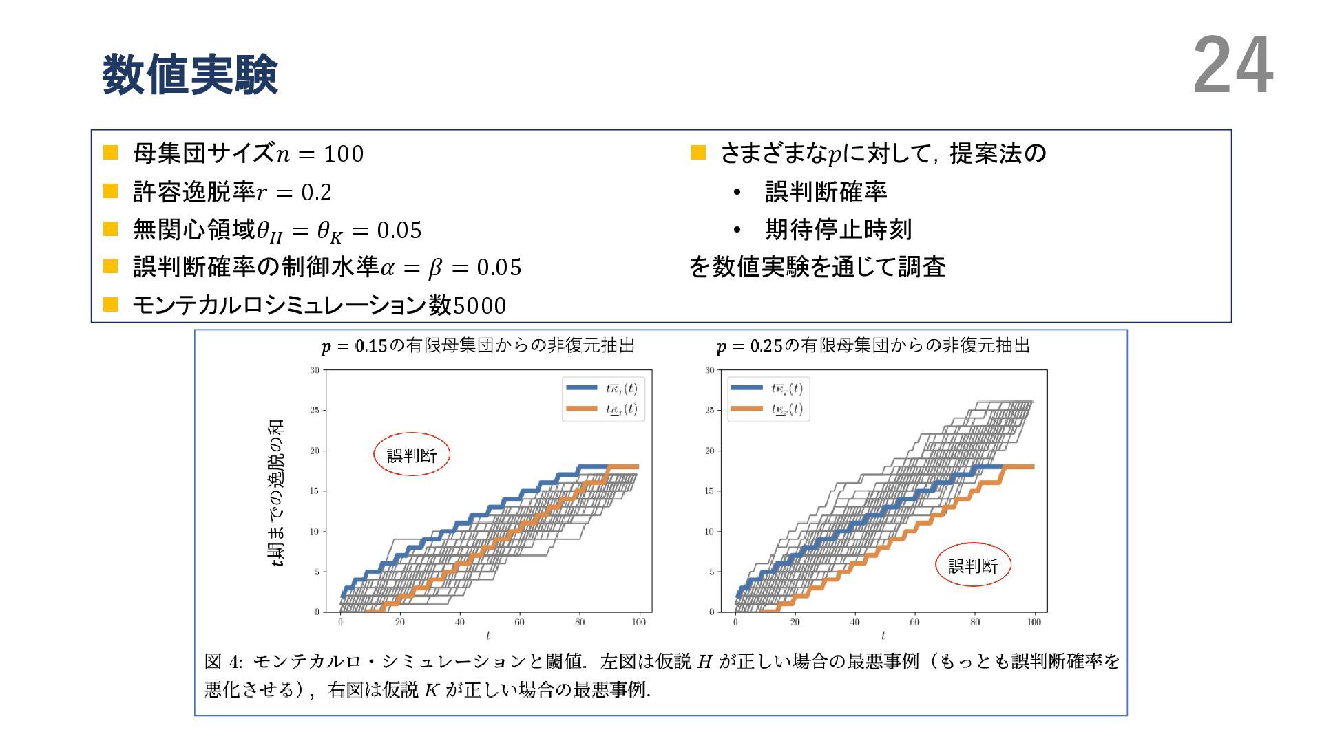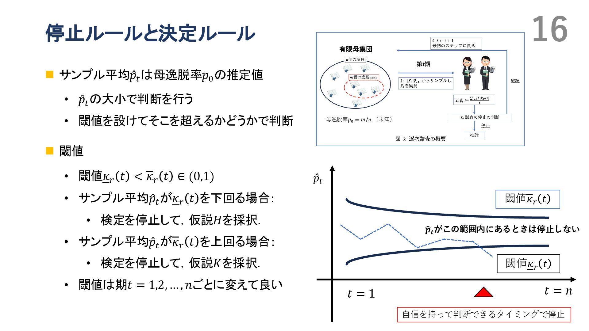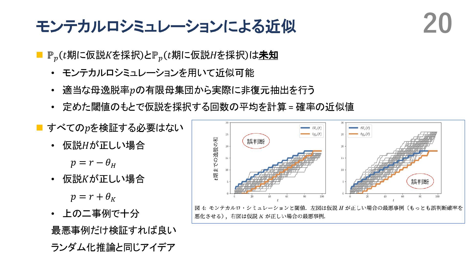 𝑟 − 𝜃𝐻 ]),すべての𝑡において以下が成立 ℙ𝑝 𝑡期に仮説𝐾を採択 = ℙ𝑝 Ƹ 𝑝𝑡 > 𝜅𝑟 𝑡 , ∀𝑠 ∈ 𝑡 − 1 Ƹ 𝑝𝑠 ∈ [𝜅𝑟 𝑠 , 𝜅𝑟 𝑠 ] ≤ 𝛼 • 同様に,仮説𝐾が正しい場合(for all 𝑝 ∈ [ 𝑟 + 𝜃𝐾 , 1]),すべての𝑡において以下が成立 ℙ𝑝 𝑡期に仮説𝐻を採択 = ℙ𝑝 Ƹ 𝑝𝑡 < 𝜅𝑟 𝑠 , ∀𝑠 ∈ 𝑡 − 1 Ƹ 𝑝𝑠 ∈ [𝜅𝑟 𝑠 , 𝜅𝑟 𝑠 ] ≤ 𝛼 ◼ ある𝑡期の誤判断確率は過去の系列 𝜅𝑟 𝑠 , 𝜅𝑟 𝑠 𝑠=1 𝑡−1 に依存 • 𝑡 = 1から順番に決定すれば良い • 𝑡の時点では,過去の 𝜅𝑟 𝑠 , 𝜅𝑟 𝑠 𝑠=1 𝑡−1 を所与として, 実際に候補となる 𝜅𝑟 𝑡 , 𝜅𝑟 𝑡 のもとで誤判断確率を計算 • 誤判断確率を制御しつつ,可能な限り小さい𝜅𝑟 𝑡 と可能な限り大きい𝜅𝑟 𝑠 を選ぶ