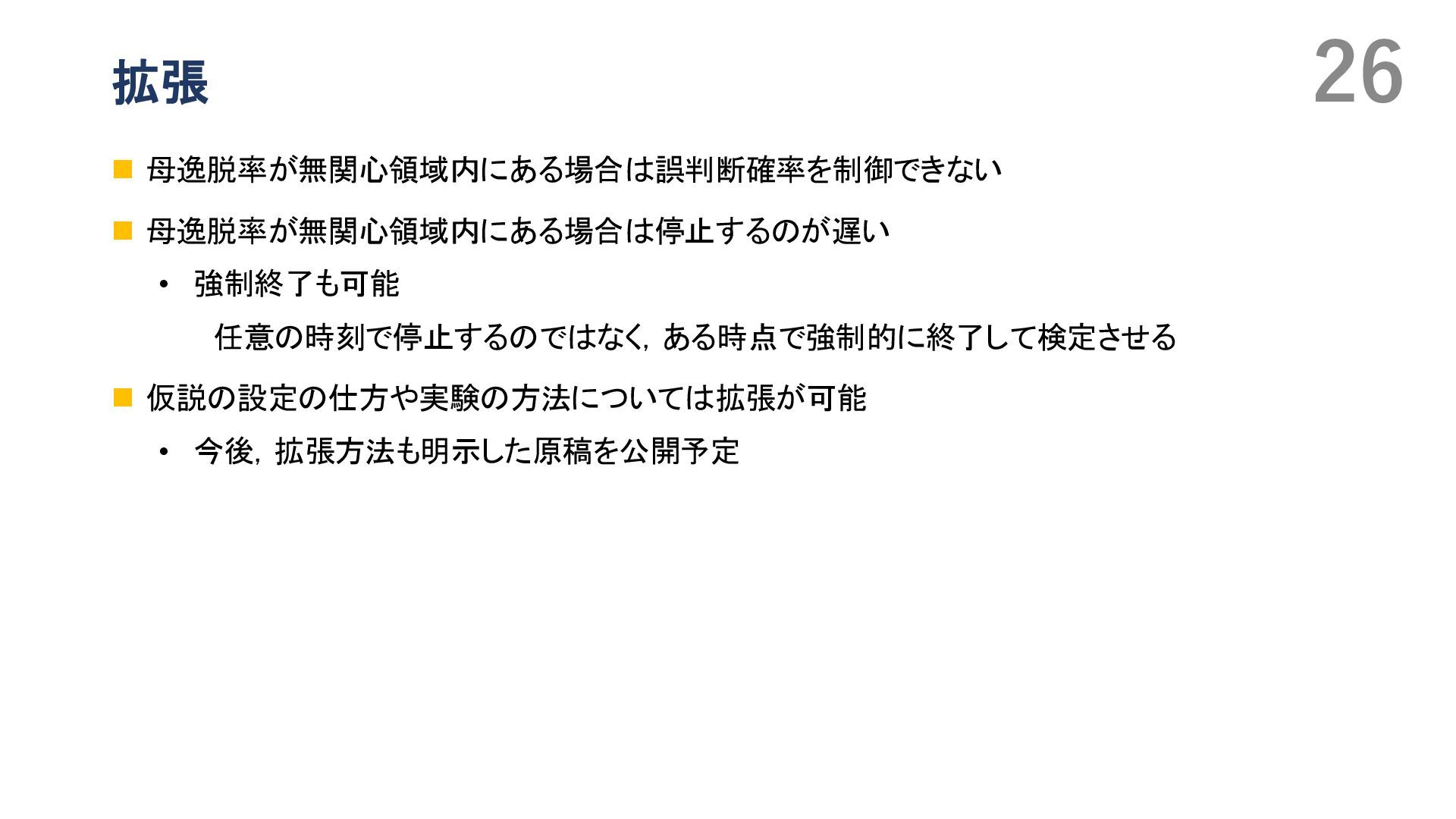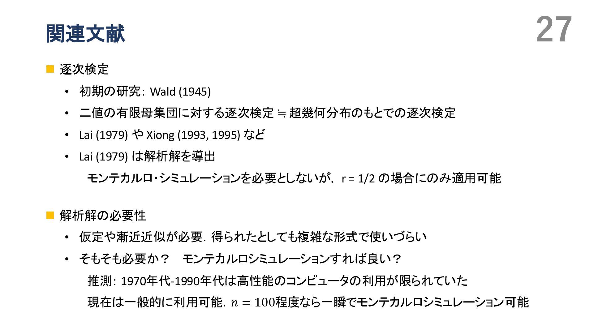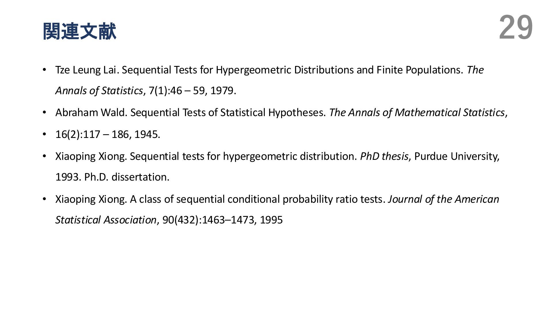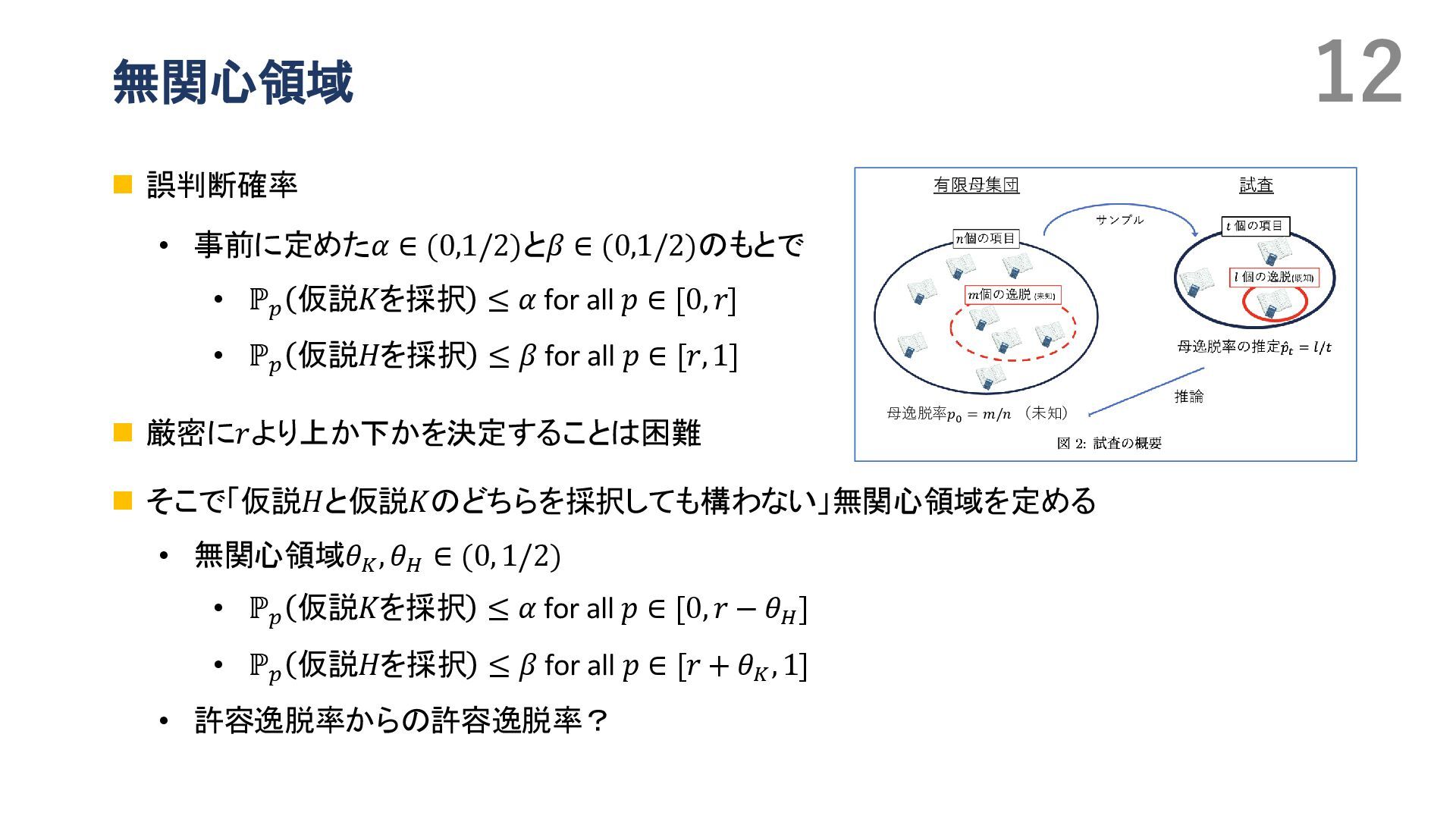 𝑟 − 𝜃𝐻 ]),すべての𝑡において以下が成立 ℙ𝑝 𝑡期に仮説𝐾を採択 = ℙ𝑝 Ƹ 𝑝𝑡 > 𝜅𝑟 𝑡 , ∀𝑠 ∈ 𝑡 − 1 Ƹ 𝑝𝑠 ∈ [𝜅𝑟 𝑠 , 𝜅𝑟 𝑠 ] ≤ 𝛼 • 同様に,仮説𝐾が正しい場合(for all 𝑝 ∈ [ 𝑟 + 𝜃𝐾 , 1]),すべての𝑡において以下が成立 ℙ𝑝 𝑡期に仮説𝐻を採択 = ℙ𝑝 Ƹ 𝑝𝑡 < 𝜅𝑟 𝑠 , ∀𝑠 ∈ 𝑡 − 1 Ƹ 𝑝𝑠 ∈ [𝜅𝑟 𝑠 , 𝜅𝑟 𝑠 ] ≤ 𝛼 ◼ ある𝑡期の誤判断確率は過去の系列 𝜅𝑟 𝑠 , 𝜅𝑟 𝑠 𝑠=1 𝑡−1 に依存 • 𝑡 = 1から順番に決定すれば良い • 𝑡の時点では,過去の 𝜅𝑟 𝑠 , 𝜅𝑟 𝑠 𝑠=1 𝑡−1 を所与として, 実際に候補となる 𝜅𝑟 𝑡 , 𝜅𝑟 𝑡 のもとで誤判断確率を計算 • 誤判断確率を制御しつつ,可能な限り小さい𝜅𝑟 𝑡 と可能な限り大きい𝜅𝑟 𝑠 を選ぶ