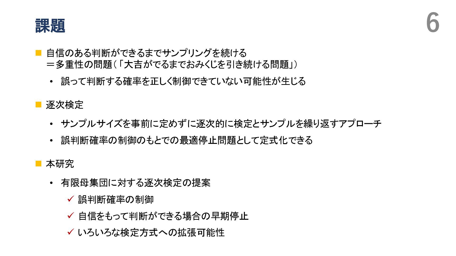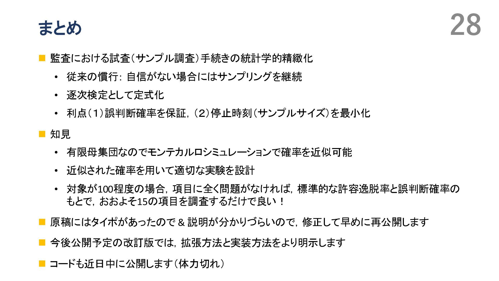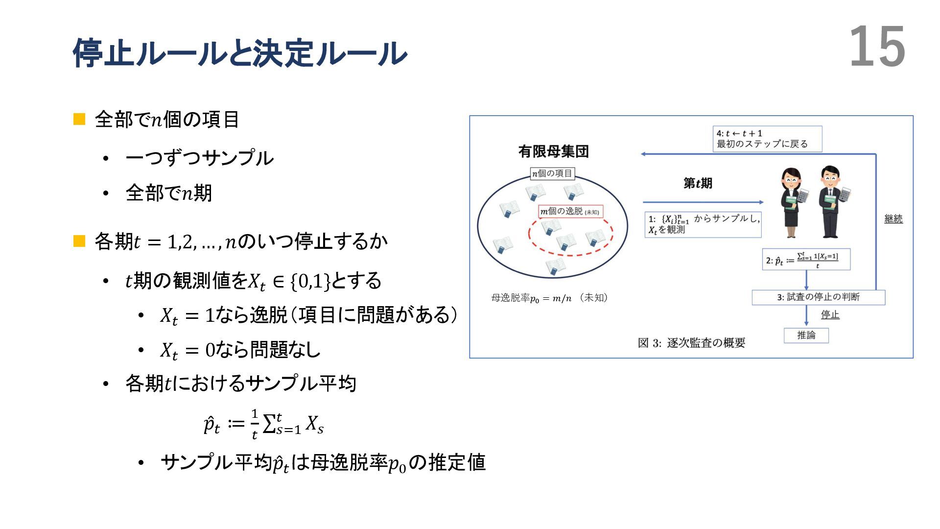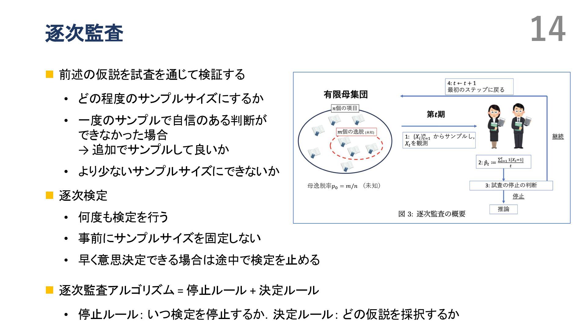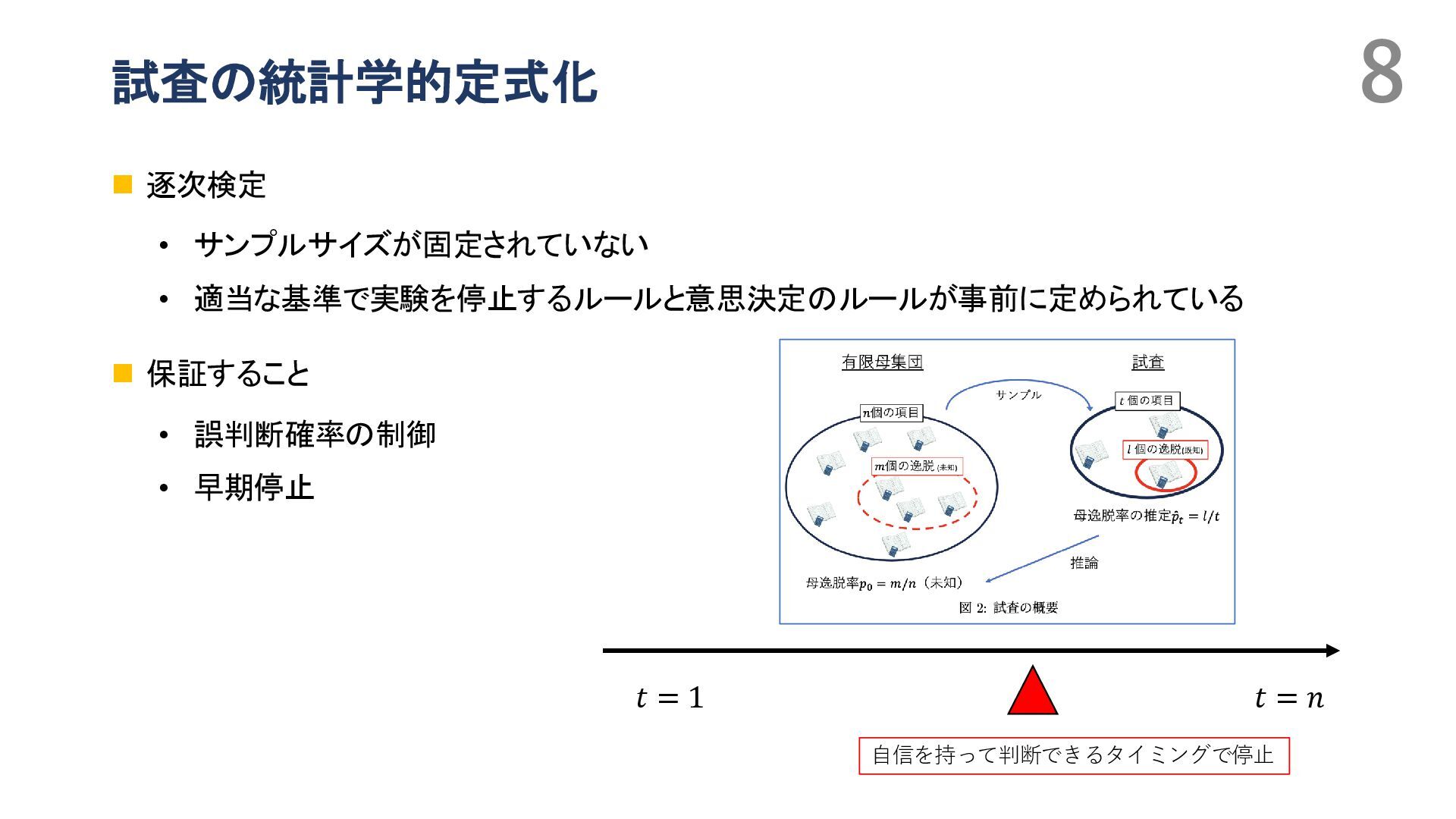 𝑟 − 𝜃𝐻 ]),すべての𝑡において以下が成立 ℙ𝑝 𝑡期に仮説𝐾を採択 = ℙ𝑝 Ƹ 𝑝𝑡 > 𝜅𝑟 𝑡 , ∀𝑠 ∈ 𝑡 − 1 Ƹ 𝑝𝑠 ∈ [𝜅𝑟 𝑠 , 𝜅𝑟 𝑠 ] ≤ 𝛼 • 同様に,仮説𝐾が正しい場合(for all 𝑝 ∈ [ 𝑟 + 𝜃𝐾 , 1]),すべての𝑡において以下が成立 ℙ𝑝 𝑡期に仮説𝐻を採択 = ℙ𝑝 Ƹ 𝑝𝑡 < 𝜅𝑟 𝑠 , ∀𝑠 ∈ 𝑡 − 1 Ƹ 𝑝𝑠 ∈ [𝜅𝑟 𝑠 , 𝜅𝑟 𝑠 ] ≤ 𝛼 ◼ ある𝑡期の誤判断確率は過去の系列 𝜅𝑟 𝑠 , 𝜅𝑟 𝑠 𝑠=1 𝑡−1 に依存 • 𝑡 = 1から順番に決定すれば良い • 𝑡の時点では,過去の 𝜅𝑟 𝑠 , 𝜅𝑟 𝑠 𝑠=1 𝑡−1 を所与として, 実際に候補となる 𝜅𝑟 𝑡 , 𝜅𝑟 𝑡 のもとで誤判断確率を計算 • 誤判断確率を制御しつつ,可能な限り小さい𝜅𝑟 𝑡 と可能な限り大きい𝜅𝑟 𝑠 を選ぶ