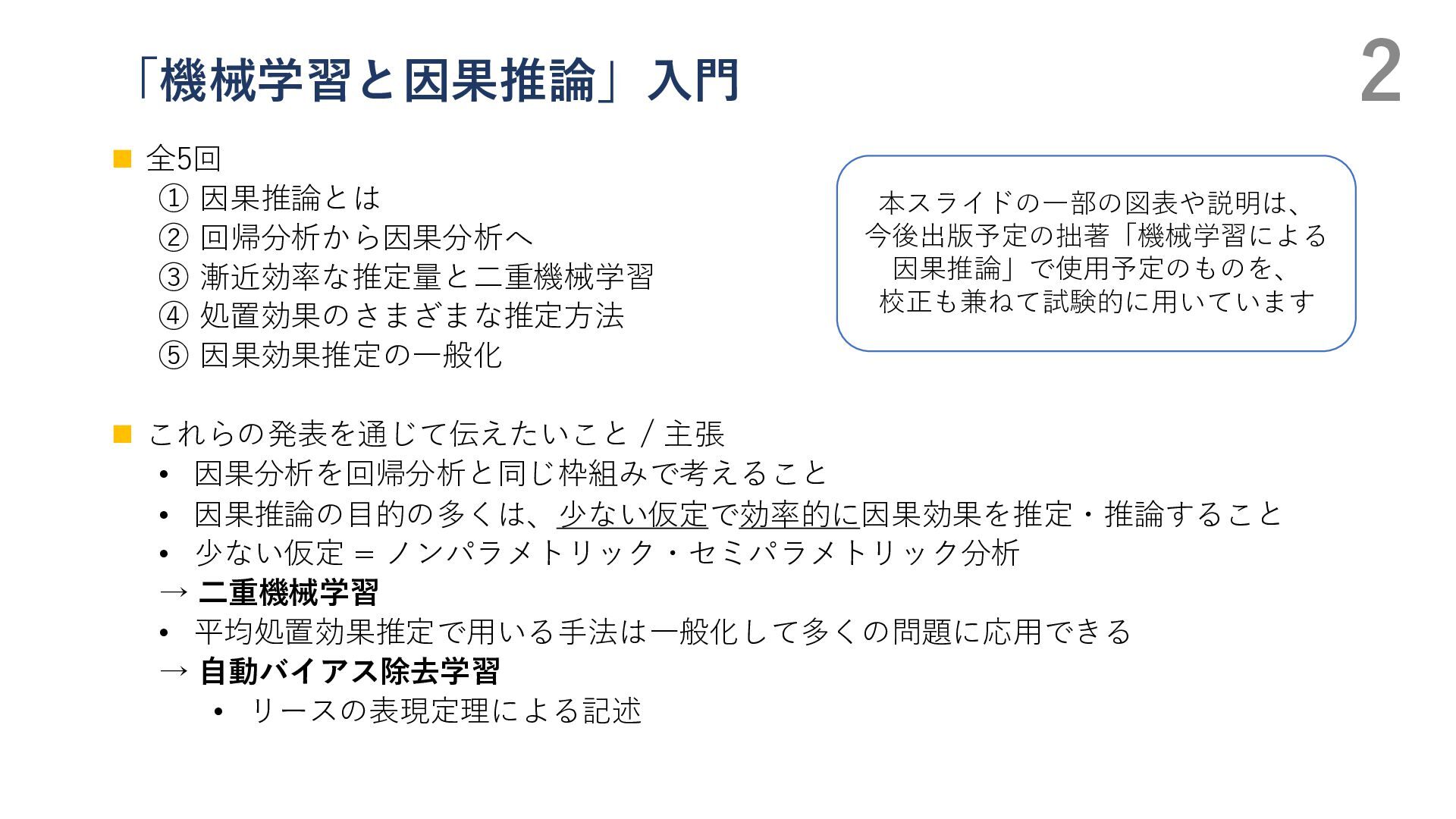 2 「機械学習と因果推論」入門 ◼ 全5回 ① 因果推論とは ② 回帰分析から因果分析へ ③ 漸近効率な推定量と二重機械学習