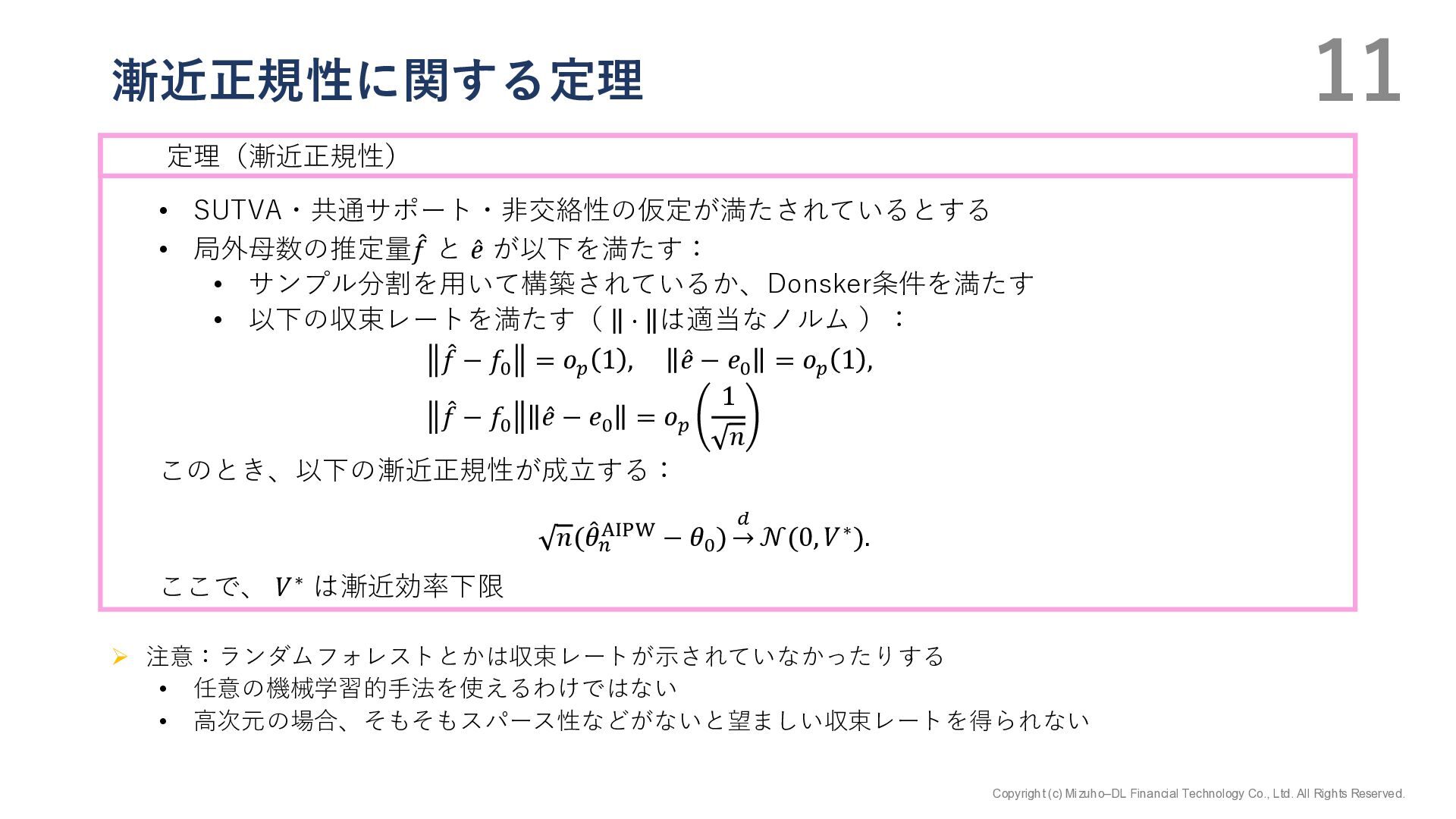 Ƹ 𝑒 が以下を満たす: • サンプル分割を用いて構築されているか、Donsker条件を満たす • 以下の収束レートを満たす( ⋅ は適当なノルム ): መ 𝑓 − 𝑓0 = 𝑜𝑝 1 , Ƹ 𝑒 − 𝑒0 = 𝑜𝑝 1 , መ 𝑓 − 𝑓0 Ƹ 𝑒 − 𝑒0 = 𝑜𝑝 1 𝑛 このとき、以下の漸近正規性が成立する: 𝑛( መ 𝜃𝑛 AIPW − 𝜃0 ) → 𝑑 𝒩(0, 𝑉∗). ここで、 𝑉∗ は漸近効率下限 ➢ 注意:ランダムフォレストとかは収束レートが示されていなかったりする • 任意の機械学習的手法を使えるわけではない • 高次元の場合、そもそもスパース性などがないと望ましい収束レートを得られない Copyright (c) Mizuho–DL Financial Technology Co., Ltd. All Rights Reserved.