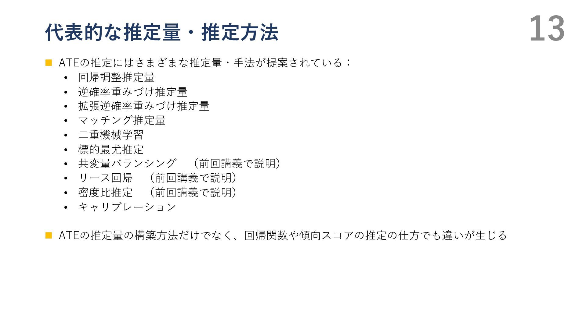 • マッチング推定量 • 二重機械学習 • 標的最尤推定 • 共変量バランシング (前回講義で説明) • リース回帰 (前回講義で説明) • 密度比推定 (前回講義で説明) • キャリブレーション ◼ ATEの推定量の構築方法だけでなく、回帰関数や傾向スコアの推定の仕方でも違いが生じる