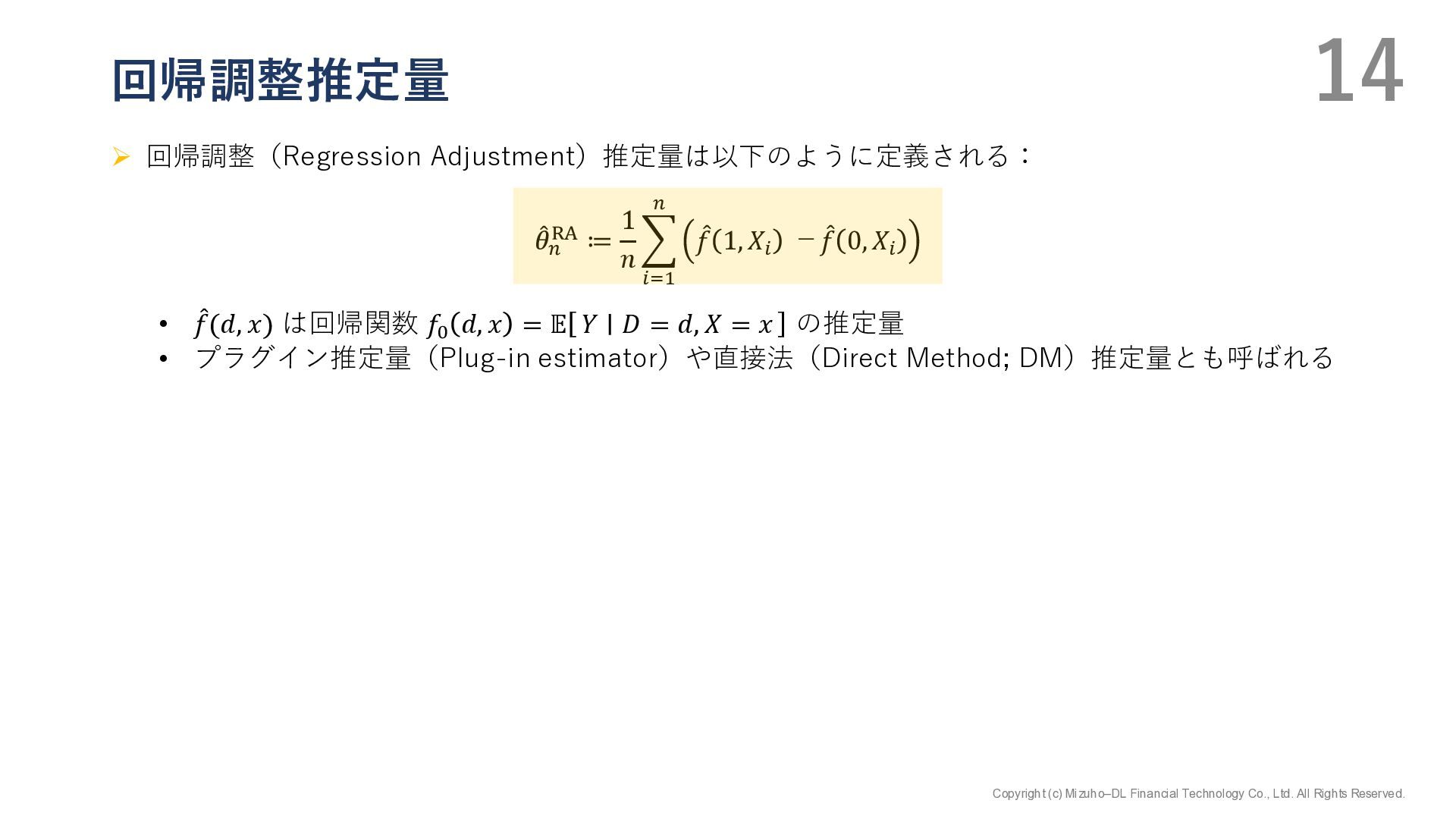𝑛 𝑖=1 𝑛 መ 𝑓 1, 𝑋𝑖 − መ 𝑓 0, 𝑋𝑖 • መ 𝑓(𝑑, 𝑥) は回帰関数 𝑓0 𝑑, 𝑥 = 𝔼 𝑌 𝐷 = 𝑑, 𝑋 = 𝑥 の推定量 • プラグイン推定量(Plug-in estimator)や直接法(Direct Method; DM)推定量とも呼ばれる Copyright (c) Mizuho–DL Financial Technology Co., Ltd. All Rights Reserved.
