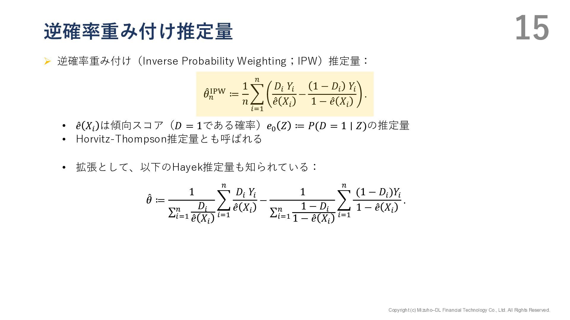 1 𝑛 𝑖=1 𝑛 𝐷𝑖 𝑌𝑖 Ƹ 𝑒 𝑋𝑖 − 1 − 𝐷𝑖 𝑌𝑖 1 − Ƹ 𝑒 𝑋𝑖 . • Ƹ 𝑒 𝑋𝑖 は傾向スコア(𝐷 = 1である確率)𝑒0 𝑍 ≔ 𝑃(𝐷 = 1 ∣ 𝑍)の推定量 • Horvitz-Thompson推定量とも呼ばれる • 拡張として、以下のHayek推定量も知られている: መ 𝜃 ≔ 1 σ 𝑖=1 𝑛 𝐷𝑖 Ƹ 𝑒 𝑋𝑖 𝑖=1 𝑛 𝐷𝑖 𝑌𝑖 Ƹ 𝑒 𝑋𝑖 − 1 σ 𝑖=1 𝑛 1 − 𝐷𝑖 1 − Ƹ 𝑒 𝑋𝑖 𝑖=1 𝑛 (1 − 𝐷𝑖 )𝑌𝑖 1 − Ƹ 𝑒 𝑋𝑖 . Copyright (c) Mizuho–DL Financial Technology Co., Ltd. All Rights Reserved.