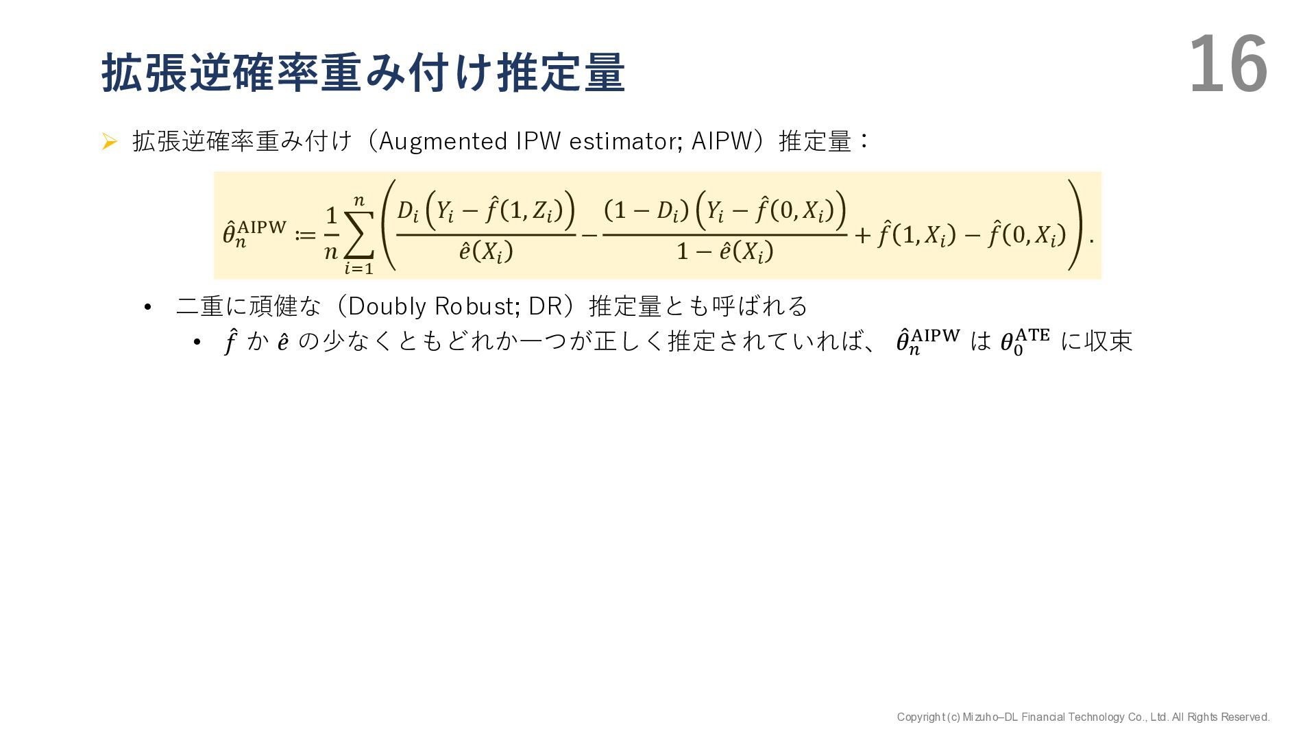 ≔ 1 𝑛 𝑖=1 𝑛 𝐷𝑖 𝑌𝑖 − መ 𝑓 1, 𝑍𝑖 Ƹ 𝑒 𝑋𝑖 − 1 − 𝐷𝑖 𝑌𝑖 − መ 𝑓 0, 𝑋𝑖 1 − Ƹ 𝑒 𝑋𝑖 + መ 𝑓 1, 𝑋𝑖 − መ 𝑓 0, 𝑋𝑖 . • 二重に頑健な(Doubly Robust; DR)推定量とも呼ばれる • መ 𝑓 か Ƹ 𝑒 の少なくともどれか一つが正しく推定されていれば、 መ 𝜃𝑛 AIPW は 𝜃0 ATE に収束 Copyright (c) Mizuho–DL Financial Technology Co., Ltd. All Rights Reserved.