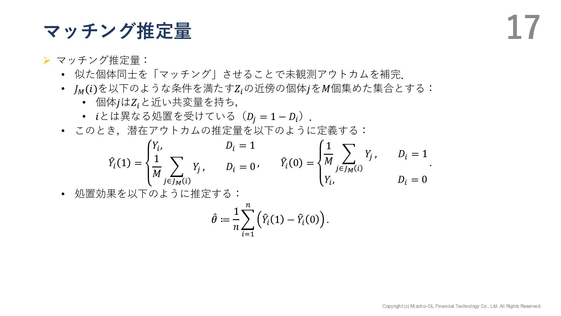 • 個体𝑗は𝑍𝑖 と近い共変量を持ち, • 𝑖とは異なる処置を受けている(𝐷𝑗 = 1 − 𝐷𝑖 ). • このとき,潜在アウトカムの推定量を以下のように定義する: 𝑌𝑖 1 = 𝑌𝑖 , 𝐷𝑖 = 1 1 𝑀 𝑗∈𝐽𝑀 𝑖 𝑌 𝑗 , 𝐷𝑖 = 0 , 𝑌𝑖 0 = 1 𝑀 𝑗∈𝐽𝑀 𝑖 𝑌 𝑗 , 𝐷𝑖 = 1 𝑌𝑖 , 𝐷𝑖 = 0 . • 処置効果を以下のように推定する: መ 𝜃 ≔ 1 𝑛 𝑖=1 𝑛 𝑌𝑖 1 − 𝑌𝑖 0 . Copyright (c) Mizuho–DL Financial Technology Co., Ltd. All Rights Reserved.