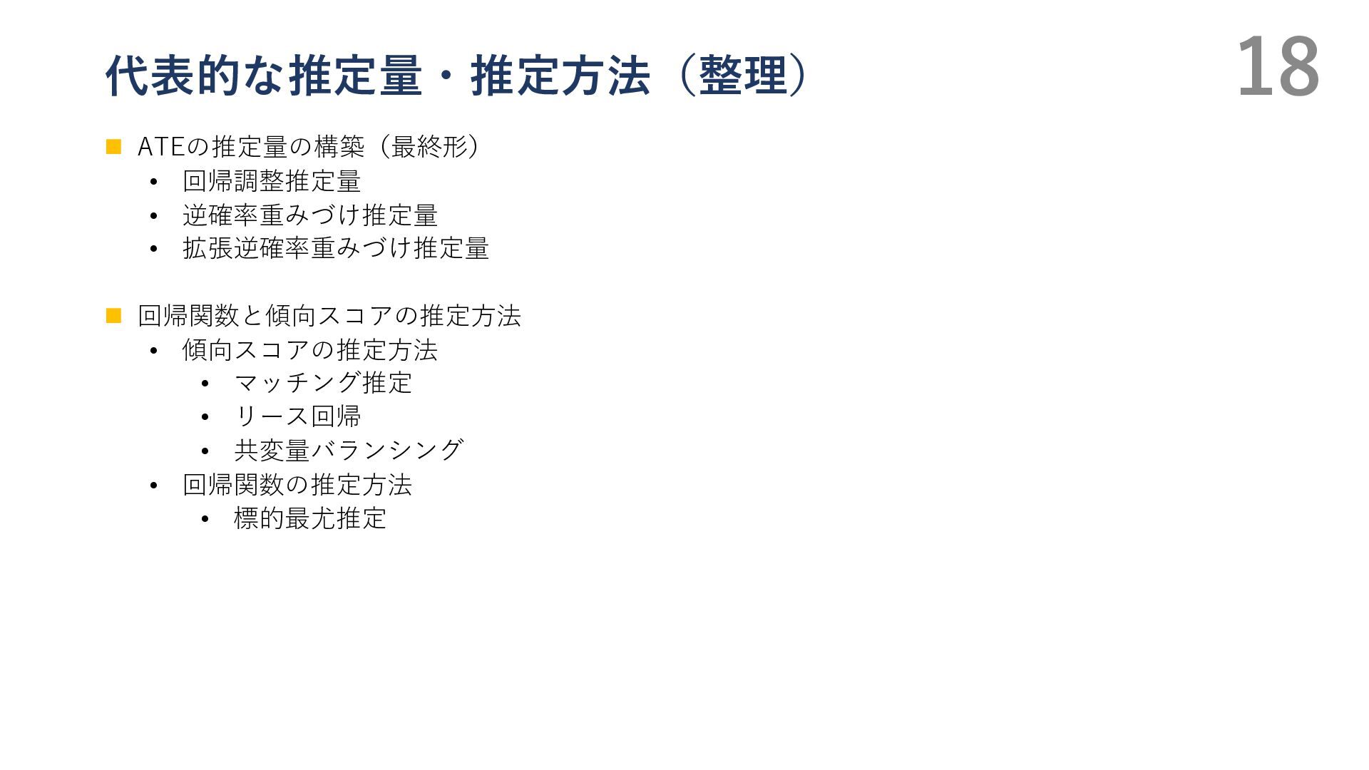推定量 • この条件こそがリース回帰 = 共変量バランシングでもある ◼ 標的最尤推定(Targeted Maximum Likelihood;TMLE) • 回帰調整推定量 መ 𝜃𝑛 RA ≔ 1 𝑛 σ 𝑖=1 𝑛 መ 𝑓 1, 𝑋𝑖 − መ 𝑓 0, 𝑋𝑖 における መ 𝑓 に補正をかけて漸近効 率性を実現 • 補正をかけた回帰関数の推定量を መ 𝑓(1) とすると、推定量の形式は以下のようにな る: መ 𝜃𝑛 TMLE ≔ 1 𝑛 𝑖=1 𝑛 መ 𝑓(1) 1, 𝑋𝑖 − መ 𝑓(1) 0, 𝑋𝑖 ◼ マッチング推定量 • 似ているユニットを集めて処置群と対照群のアウトカムを比較 • 回帰調整推定量やIPW推定量やAIPW推定量としても解釈可能(上記の等号が成り立 つ)