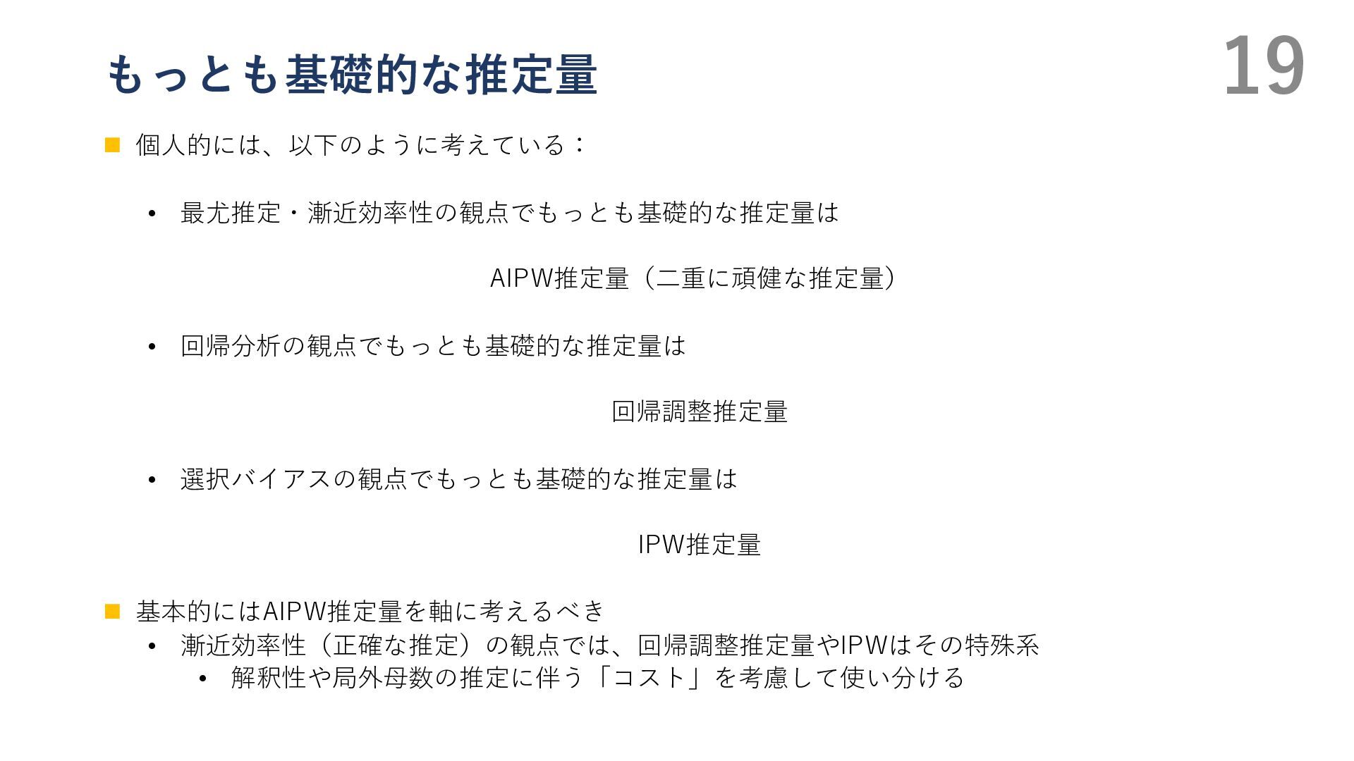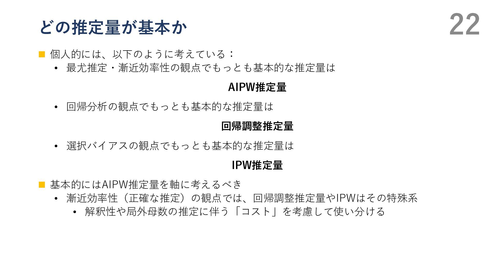 • 選択バイアスの観点でもっとも基礎的な推定量は IPW推定量 ◼ 基本的にはAIPW推定量を軸に考えるべき • 漸近効率性(正確な推定)の観点では、回帰調整推定量やIPWはその特殊系 • 解釈性や局外母数の推定に伴う「コスト」を考慮して使い分ける