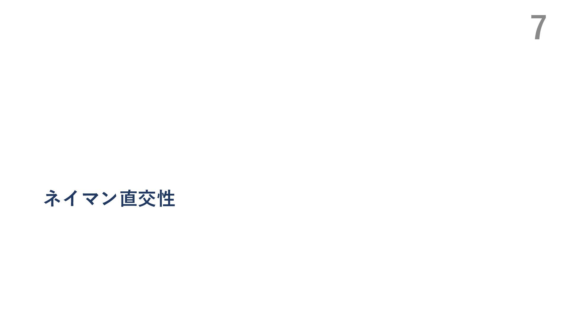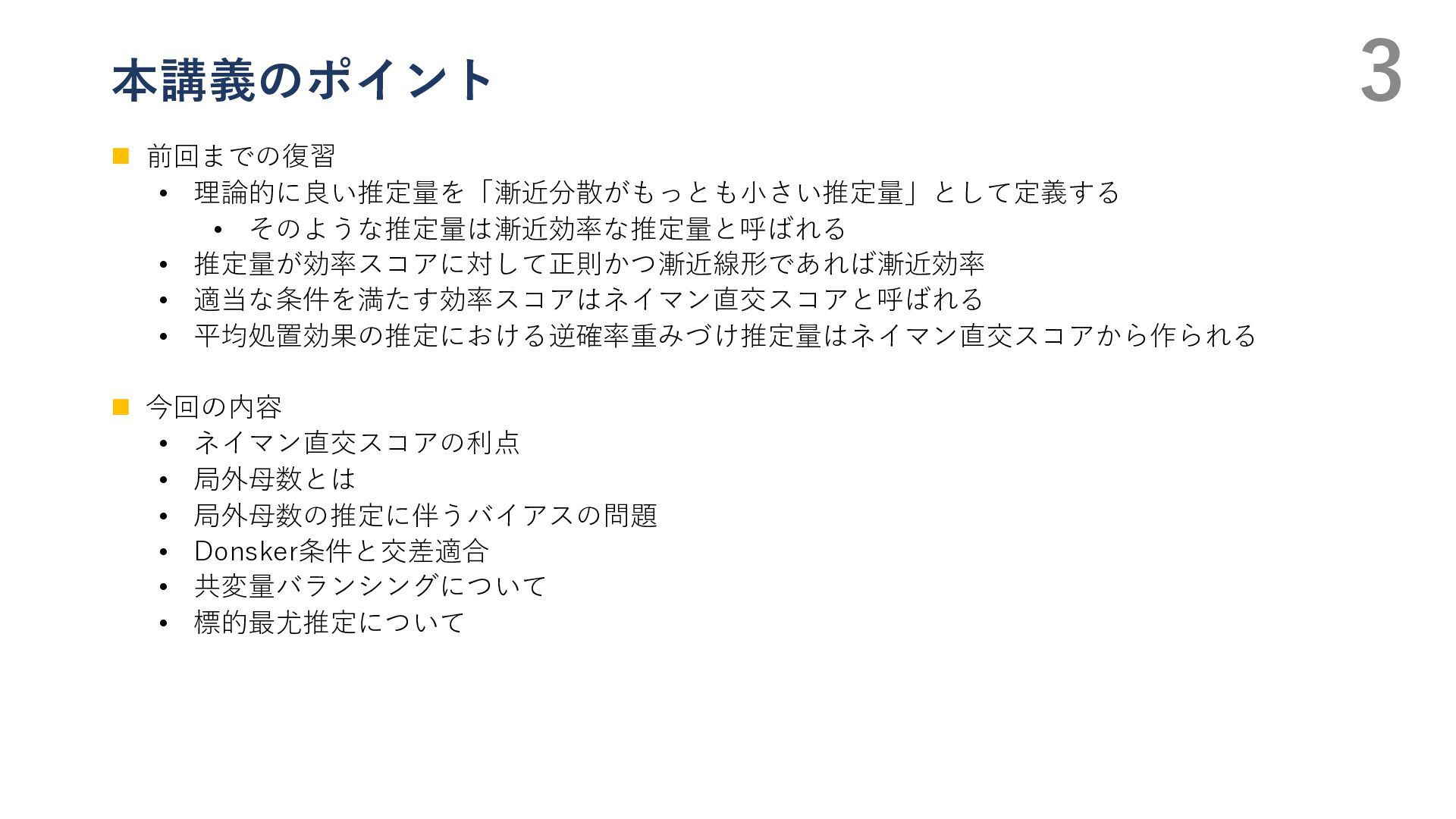 • 適当な条件を満たす効率スコアはネイマン直交スコアと呼ばれる • 平均処置効果の推定における逆確率重みづけ推定量はネイマン直交スコアから作られる ◼ 今回の内容 • ネイマン直交スコアの利点 • 局外母数とは • 局外母数の推定に伴うバイアスの問題 • Donsker条件と交差適合 • 共変量バランシングについて • 標的最尤推定について