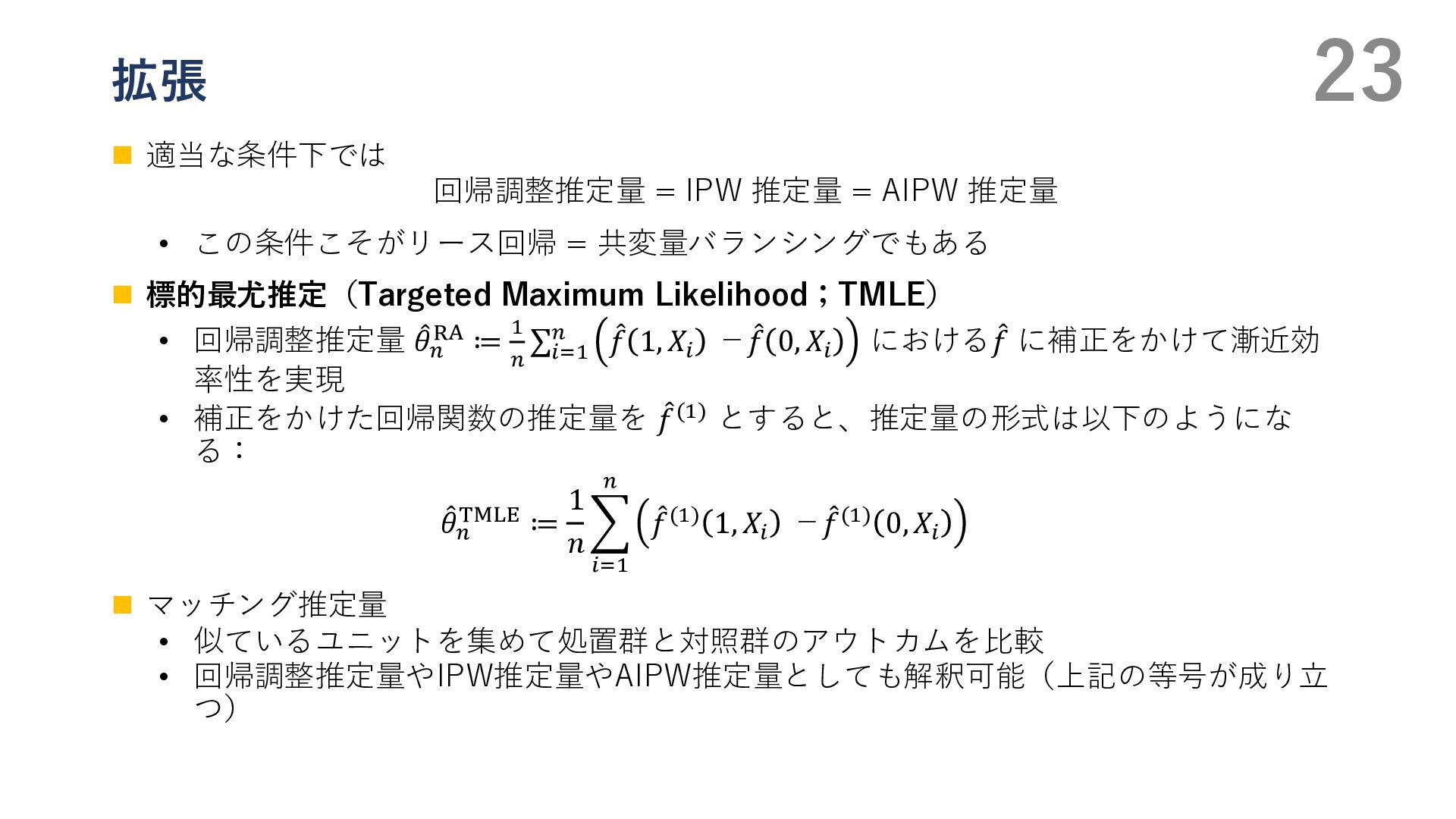 22 どの推定量が基本か ◼ 個人的には、以下のように考えている: • 最尤推定・漸近効率性の観点でもっとも基本的な推定量は AIPW推定量 • 回帰分析の観点でもっとも基本的な推定量は 回帰調整推定量