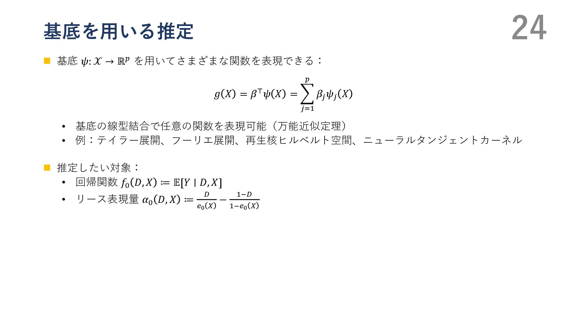 𝑋 = 𝛽⊤𝜓 𝑋 = 𝑗=1 𝑝 𝛽𝑗 𝜓𝑗 𝑋 • 基底の線型結合で任意の関数を表現可能(万能近似定理) • 例:テイラー展開、フーリエ展開、再生核ヒルベルト空間、ニューラルタンジェントカーネル ◼ 推定したい対象: • 回帰関数 𝑓0 𝐷, 𝑋 ≔ 𝔼[𝑌 ∣ 𝐷, 𝑋] • リース表現量 𝛼0 𝐷, 𝑋 ≔ 𝐷 𝑒0 𝑋 − 1−𝐷 1−𝑒0 𝑋
