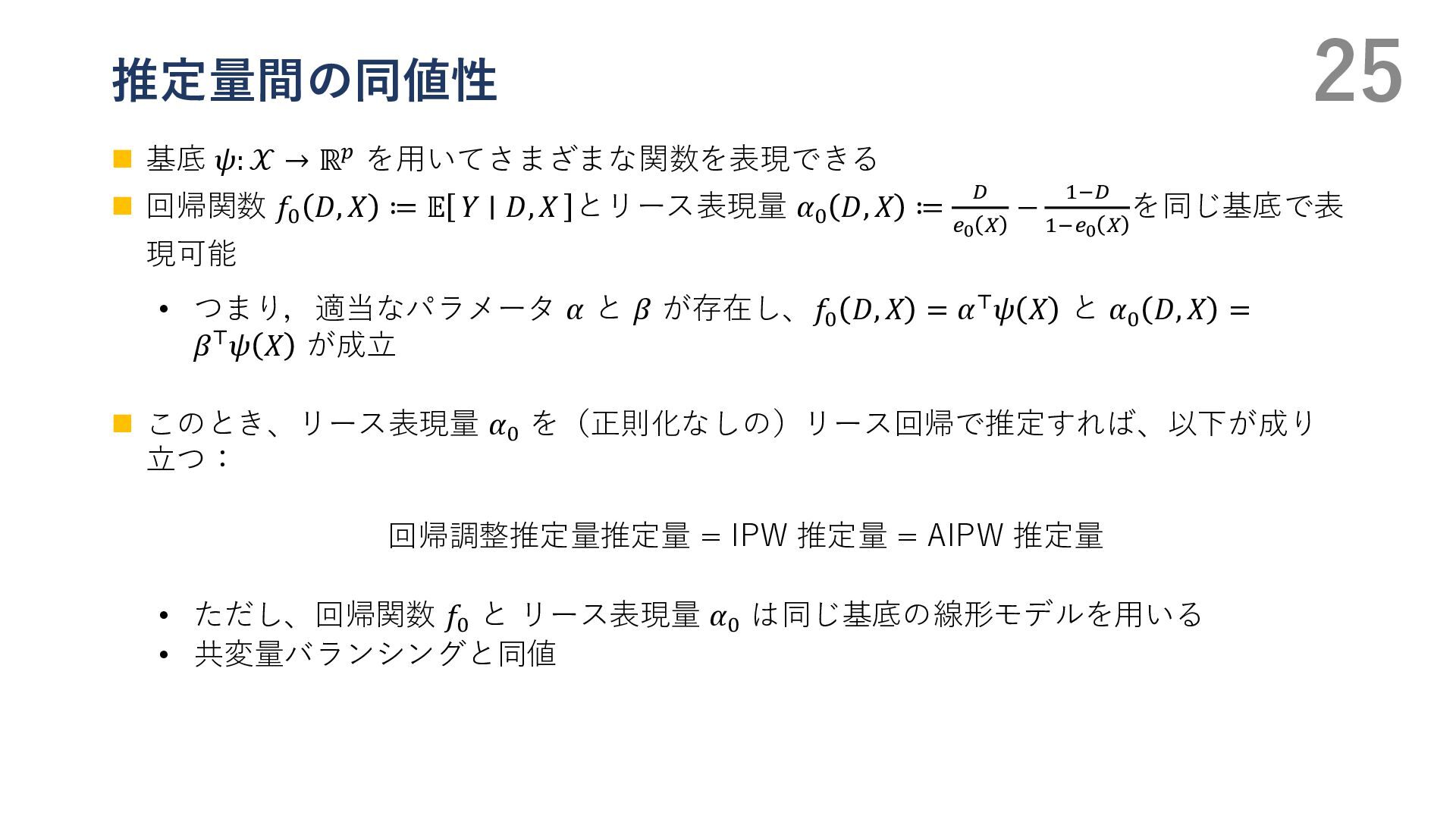 回帰関数 𝑓0 𝐷, 𝑋 ≔ 𝔼 𝑌 𝐷, 𝑋 とリース表現量 𝛼0 𝐷, 𝑋 ≔ 𝐷 𝑒0 𝑋 − 1−𝐷 1−𝑒0 𝑋 を同じ基底で表 現可能 • つまり,適当なパラメータ 𝛼 と 𝛽 が存在し、𝑓0 𝐷, 𝑋 = 𝛼⊤𝜓 𝑋 と 𝛼0 𝐷, 𝑋 = 𝛽⊤𝜓 𝑋 が成立 ◼ このとき、リース表現量 𝛼0 を(正則化なしの)リース回帰で推定すれば、以下が成り 立つ: 回帰調整推定量推定量 = IPW 推定量 = AIPW 推定量 • ただし、回帰関数 𝑓0 と リース表現量 𝛼0 は同じ基底の線形モデルを用いる • 共変量バランシングと同値