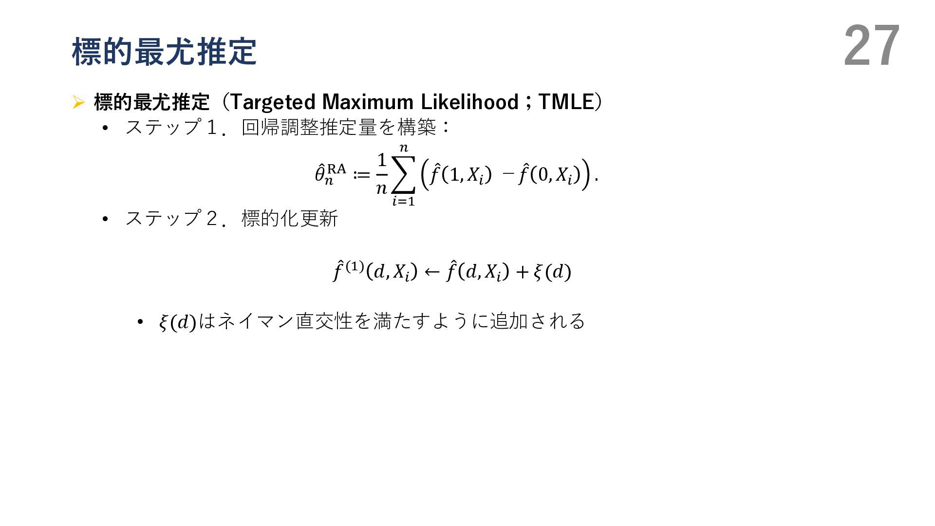 RA ≔ 1 𝑛 𝑖=1 𝑛 መ 𝑓 1, 𝑋𝑖 − መ 𝑓 0, 𝑋𝑖 . • ステップ2.標的化更新 መ 𝑓(1) 𝑑, 𝑋𝑖 ← መ 𝑓 𝑑, 𝑋𝑖 + 𝜉(𝑑) • 𝜉(𝑑)はネイマン直交性を満たすように追加される
