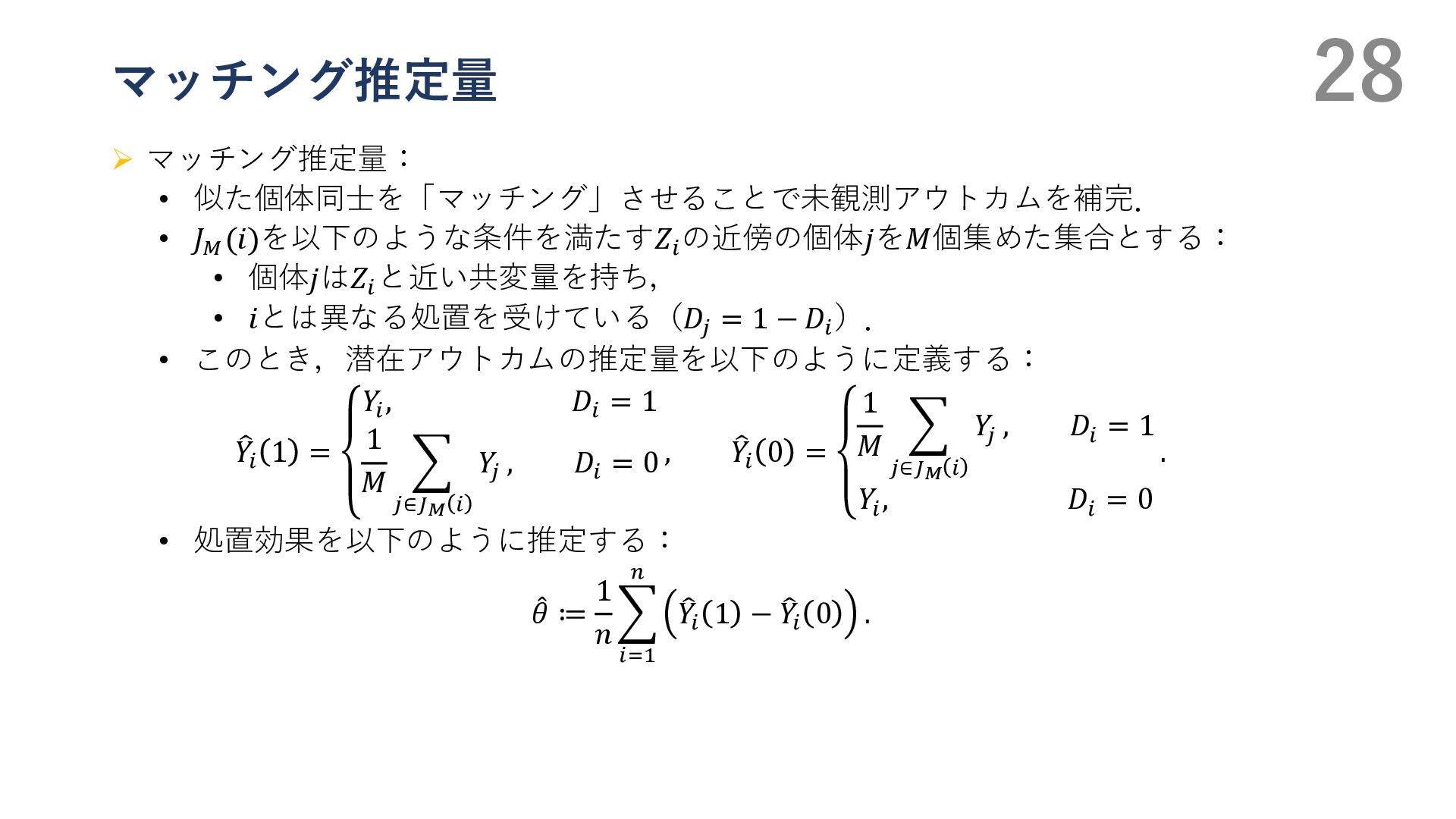 • 個体𝑗は𝑍𝑖 と近い共変量を持ち, • 𝑖とは異なる処置を受けている(𝐷𝑗 = 1 − 𝐷𝑖 ). • このとき,潜在アウトカムの推定量を以下のように定義する: 𝑌𝑖 1 = 𝑌𝑖 , 𝐷𝑖 = 1 1 𝑀 𝑗∈𝐽𝑀 𝑖 𝑌 𝑗 , 𝐷𝑖 = 0 , 𝑌𝑖 0 = 1 𝑀 𝑗∈𝐽𝑀 𝑖 𝑌 𝑗 , 𝐷𝑖 = 1 𝑌𝑖 , 𝐷𝑖 = 0 . • 処置効果を以下のように推定する: መ 𝜃 ≔ 1 𝑛 𝑖=1 𝑛 𝑌𝑖 1 − 𝑌𝑖 0 .