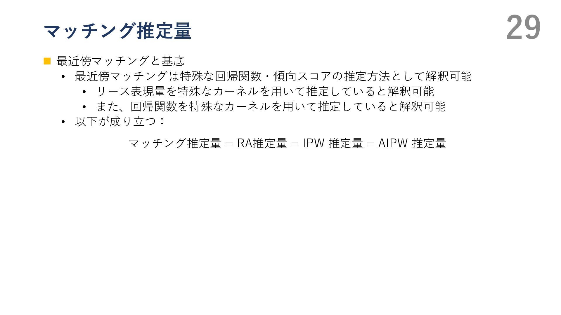 • 以下が成り立つ: マッチング推定量 = RA推定量 = IPW 推定量 = AIPW 推定量