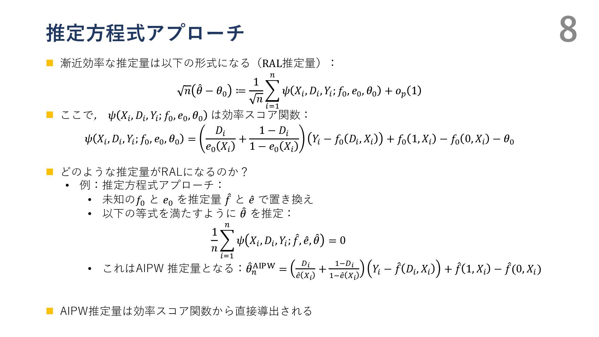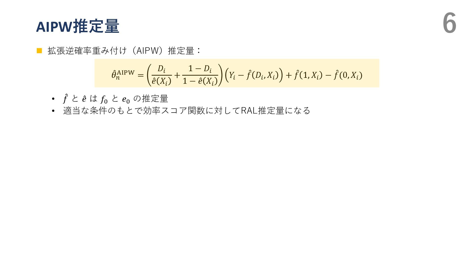 1 𝑛 𝑖=1 𝑛 𝜓 𝑋𝑖 , 𝐷𝑖 , 𝑌𝑖 ; 𝑓0 , 𝑒0 , 𝜃0 + 𝑜𝑝 1 ◼ ここで, 𝜓 𝑋𝑖 , 𝐷𝑖 , 𝑌𝑖 ; 𝑓0 , 𝑒0 , 𝜃0 は効率スコア関数: 𝜓 𝑋𝑖 , 𝐷𝑖 , 𝑌𝑖 ; 𝑓0 , 𝑒0 , 𝜃0 = 𝐷𝑖 𝑒0 𝑋𝑖 + 1 − 𝐷𝑖 1 − 𝑒0 𝑋𝑖 𝑌𝑖 − 𝑓0 𝐷𝑖 , 𝑋𝑖 + 𝑓0 1, 𝑋𝑖 − 𝑓0 0, 𝑋𝑖 − 𝜃0 ◼ どのような推定量がRALになるのか? • 例:推定方程式アプローチ: • 未知の𝑓0 と 𝑒0 を推定量 መ 𝑓 と Ƹ 𝑒 で置き換え • 以下の等式を満たすように መ 𝜃 を推定: 1 𝑛 𝑖=1 𝑛 𝜓 𝑋𝑖 , 𝐷𝑖 , 𝑌𝑖 ; መ 𝑓, Ƹ 𝑒, መ 𝜃 = 0 • これはAIPW 推定量となる: መ 𝜃𝑛 AIPW = 𝐷𝑖 Ƹ 𝑒 𝑋𝑖 + 1−𝐷𝑖 1− Ƹ 𝑒 𝑋𝑖 𝑌𝑖 − መ 𝑓 𝐷𝑖 , 𝑋𝑖 + መ 𝑓 1, 𝑋𝑖 − መ 𝑓(0, 𝑋𝑖 ) ◼ AIPW推定量は効率スコア関数から直接導出される
