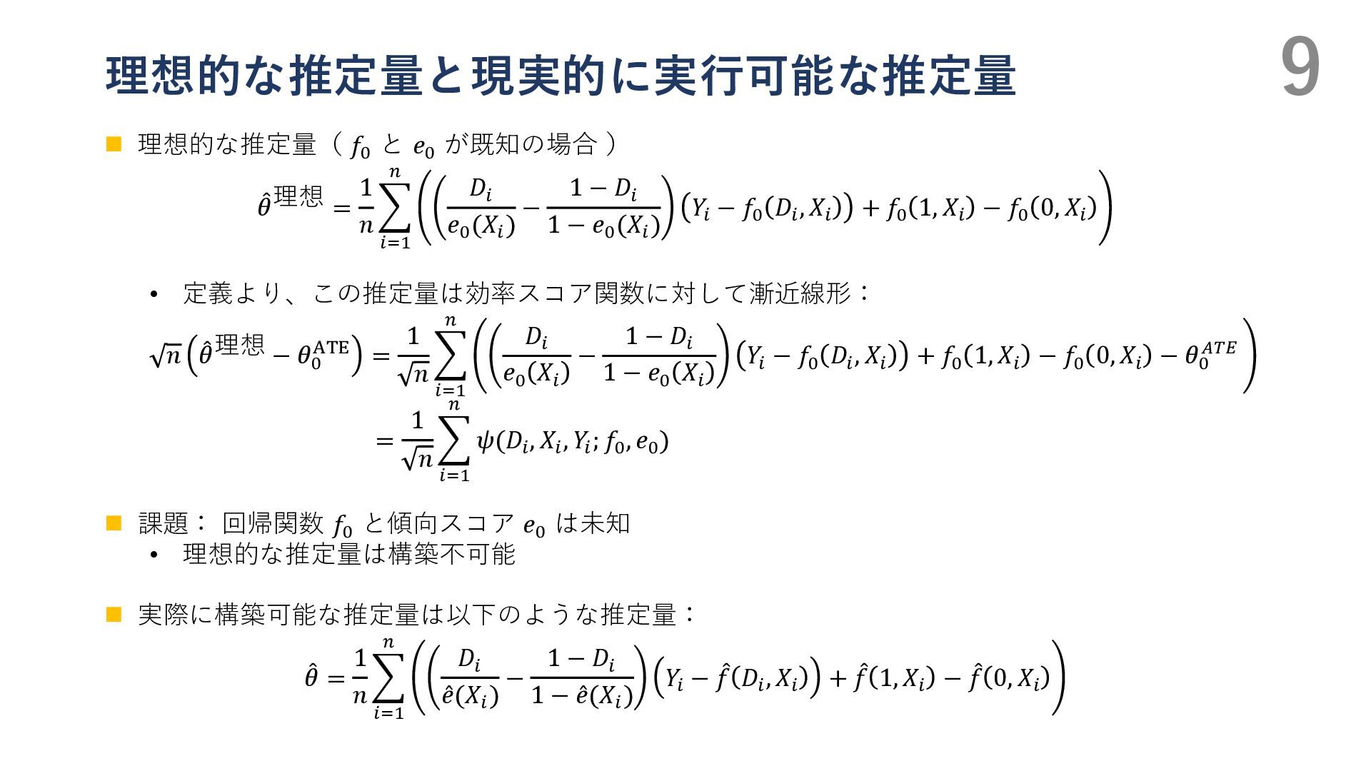 𝜃理想 = 1 𝑛 𝑖=1 𝑛 𝐷𝑖 𝑒0 (𝑋𝑖 ) − 1 − 𝐷𝑖 1 − 𝑒0 (𝑋𝑖 ) 𝑌𝑖 − 𝑓0 𝐷𝑖 , 𝑋𝑖 + 𝑓0 1, 𝑋𝑖 − 𝑓0 0, 𝑋𝑖 • 定義より、この推定量は効率スコア関数に対して漸近線形: 𝑛 መ 𝜃理想 − 𝜃0 ATE = 1 𝑛 𝑖=1 𝑛 𝐷𝑖 𝑒0 𝑋𝑖 − 1 − 𝐷𝑖 1 − 𝑒0 𝑋𝑖 𝑌𝑖 − 𝑓0 𝐷𝑖 , 𝑋𝑖 + 𝑓0 1, 𝑋𝑖 − 𝑓0 0, 𝑋𝑖 − 𝜃0 𝐴𝑇𝐸 = 1 𝑛 𝑖=1 𝑛 𝜓(𝐷𝑖 , 𝑋𝑖 , 𝑌𝑖 ; 𝑓0 , 𝑒0 ) ◼ 課題: 回帰関数 𝑓0 と傾向スコア 𝑒0 は未知 • 理想的な推定量は構築不可能 ◼ 実際に構築可能な推定量は以下のような推定量: መ 𝜃 = 1 𝑛 𝑖=1 𝑛 𝐷𝑖 Ƹ 𝑒(𝑋𝑖 ) − 1 − 𝐷𝑖 1 − Ƹ 𝑒(𝑋𝑖 ) 𝑌𝑖 − መ 𝑓 𝐷𝑖 , 𝑋𝑖 + መ 𝑓 1, 𝑋𝑖 − መ 𝑓 0, 𝑋𝑖