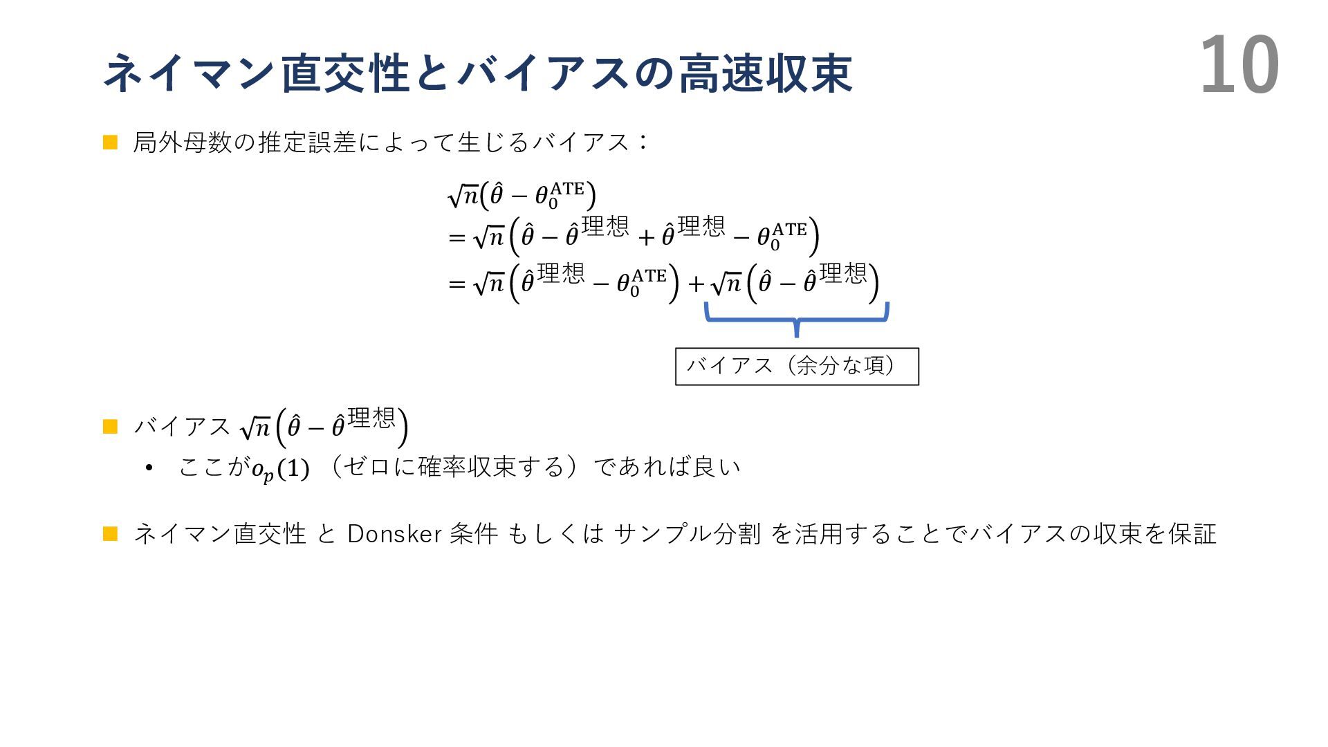 = 𝑛 መ 𝜃 − መ 𝜃理想 + መ 𝜃理想 − 𝜃0 ATE = 𝑛 መ 𝜃理想 − 𝜃0 ATE + 𝑛 መ 𝜃 − መ 𝜃理想 ◼ バイアス 𝑛 መ 𝜃 − መ 𝜃理想 • ここが𝑜𝑝 (1) (ゼロに確率収束する)であれば良い ◼ ネイマン直交性 と Donsker 条件 もしくは サンプル分割 を活用することでバイアスの収束を保証 バイアス(余分な項)
