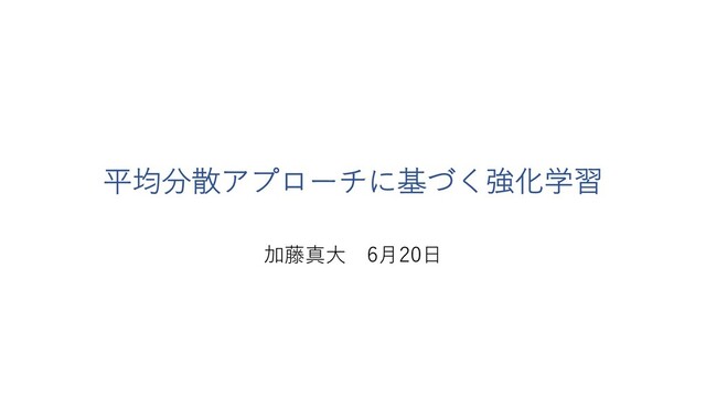 2013. n Tamer and Castro, Policy Gradients with Variance Related Risk Criteria, NeurIPS 2012. n Xie, Liu, Xu, Ghavamzadeh, Chow, and Lyu, A Block Coordinate Algorithm for Mean- Variance Optimazation. NeurIPS 2018 n Bisi, Sabbioni, Vittori, Papini, and Restelli, Risk-Averse Trust Region Optimization for Reward-Volatility Reduction, AAAI 2020. n Zhang, Liu, and Whiteson, Mean-Variance Policy Iteration for Risk-Averse Reinforcement Learning, arXiv 2020. n 森村哲郎「強化学習」 n 強化学習の学習アルゴリズムの分類 https://note.com/npaka/n/n5a6bc4825555 41