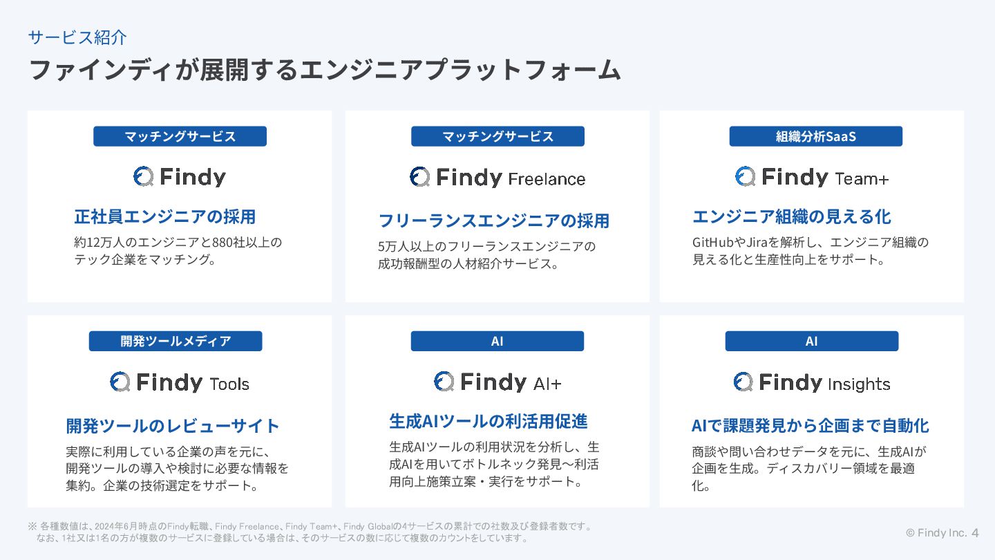 なお、1社又は1名の方が複数のサービスに登録している場合は、そのサービスの数に応じて複数のカウントをしています。 組織分析SaaS GitHubやJiraを解析し、エンジニア組織の ⾒える化と⽣産性向上をサポート。 エンジニア組織の⾒える化 マッチングサービス 約12万⼈のエンジニアと880社以上の テック企業をマッチング。 正社員エンジニアの採⽤ 開発ツールメディア 実際に利⽤している企業の声を元に、 開発ツールの導⼊や検討に必要な情報を 集約。企業の技術選定をサポート。 開発ツールのレビューサイト ⽣成AIツールの利⽤状況を分析し、⽣ 成AIを⽤いてボトルネック発⾒〜利活 ⽤向上施策⽴案‧実⾏をサポート。 ⽣成AIツールの利活⽤促進 AI 5万⼈以上のフリーランスエンジニアの 成功報酬型の⼈材紹介サービス。 フリーランスエンジニアの採⽤ マッチングサービス 商談や問い合わせデータを元に、⽣成AIが 企画を⽣成。ディスカバリー領域を最適 化。 AIで課題発⾒から企画まで⾃動化 AI 4