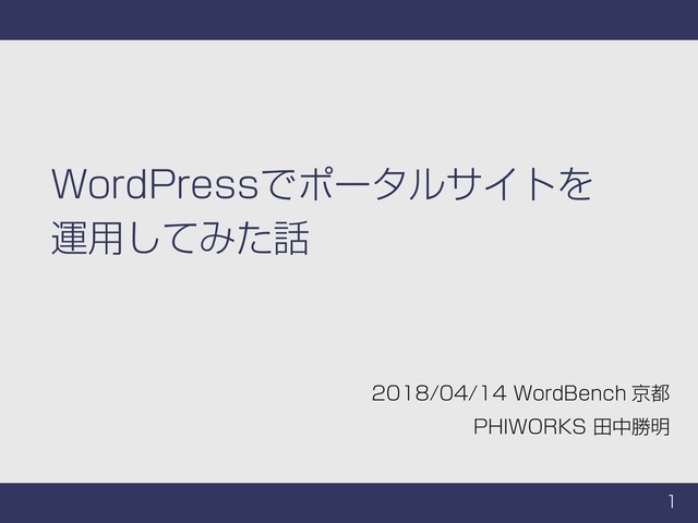 1 WordPress でポータルサイトを運用してみた話 WordPressでポータルサイトを 運用してみた話 2018/04/14 WordBench 京都 PHIWORKS 田中勝明