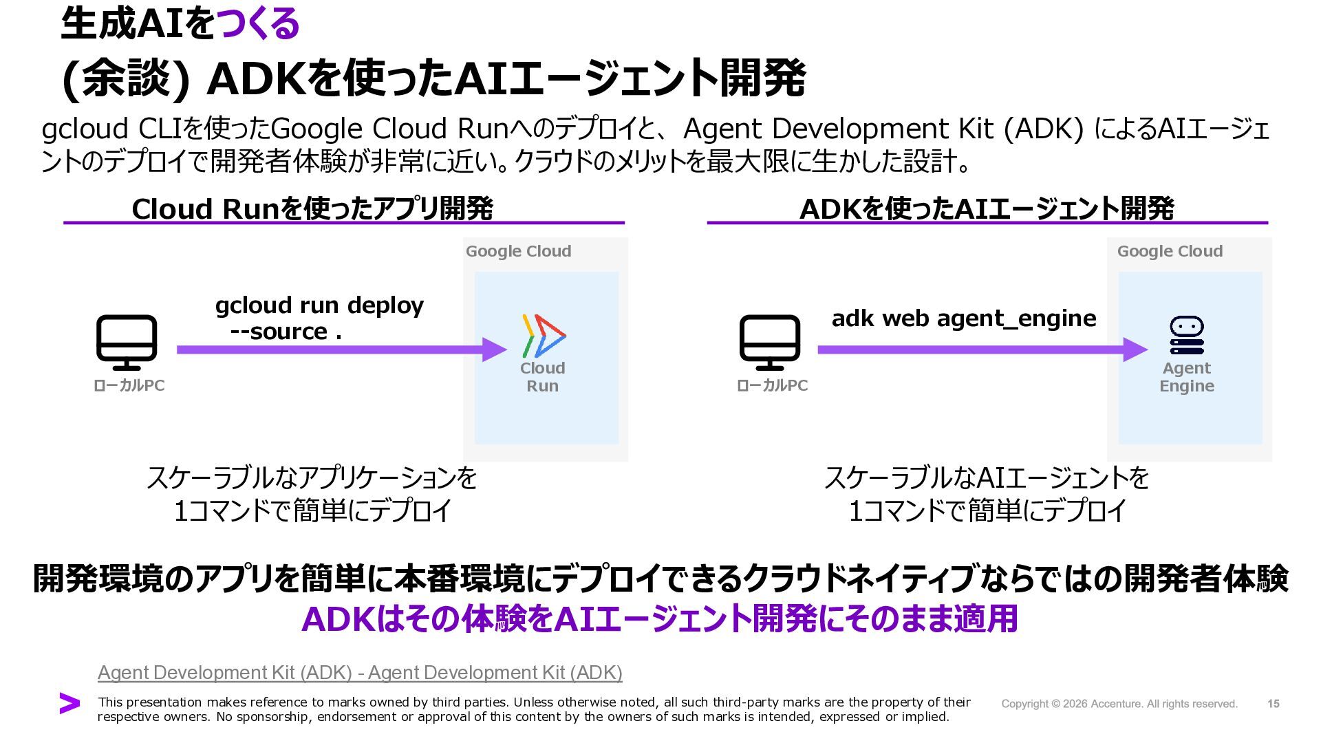 によるAIエージェ ントのデプロイで開発者体験が非常に近い。クラウドのメリットを最大限に生かした設計。 生成AIをつくる スケーラブルなアプリケーションを 1コマンドで簡単にデプロイ 開発環境のアプリを簡単に本番環境にデプロイできるクラウドネイティブならではの開発者体験 ADKはその体験をAIエージェント開発にそのまま適用 スケーラブルなAIエージェントを 1コマンドで簡単にデプロイ ADKを使ったAIエージェント開発 Cloud Runを使ったアプリ開発 gcloud run deploy --source . adk web agent_engine Cloud Run Agent Engine ローカルPC ローカルPC This presentation makes reference to marks owned by third parties. Unless otherwise noted, all such third-party marks are the property of their respective owners. No sponsorship, endorsement or approval of this content by the owners of such marks is intended, expressed or implied. Google Cloud Google Cloud Agent Development Kit (ADK) - Agent Development Kit (ADK)