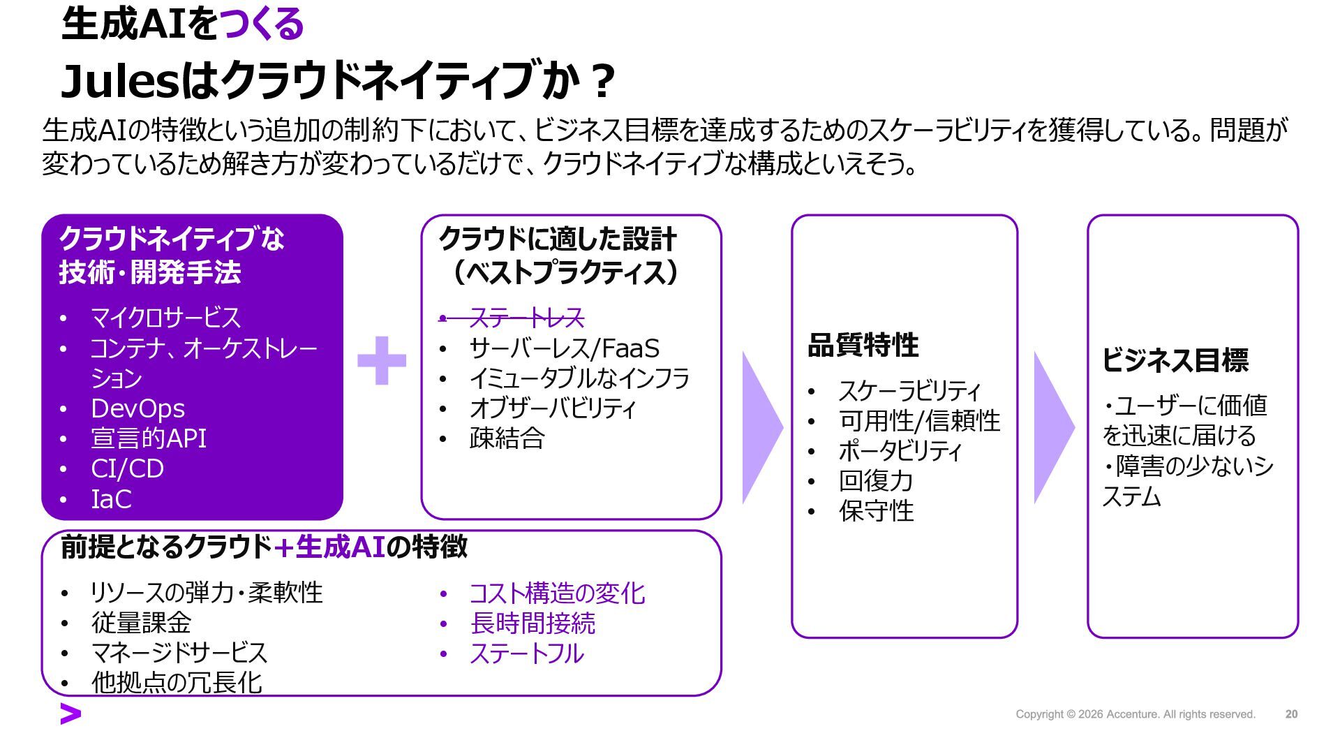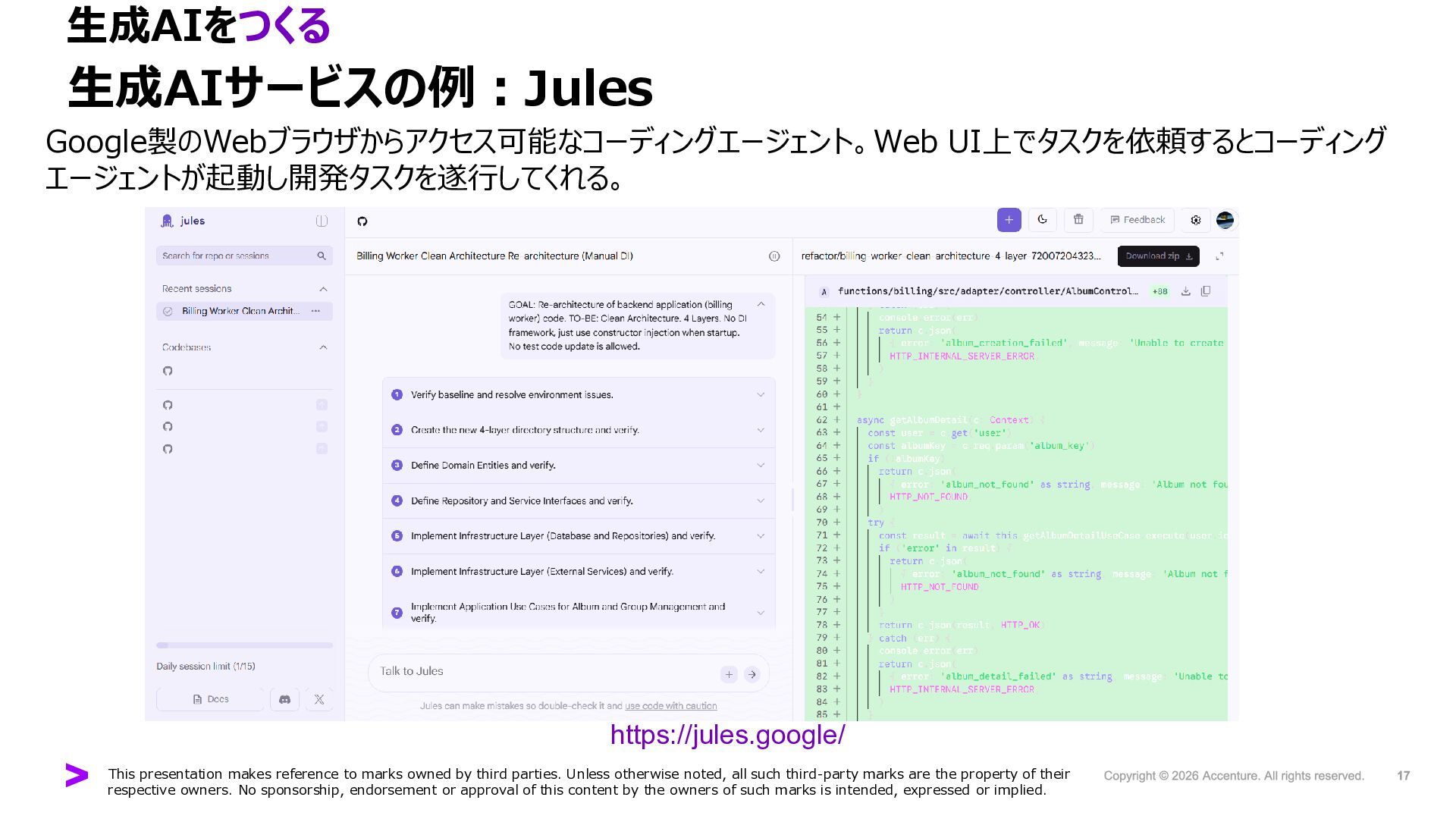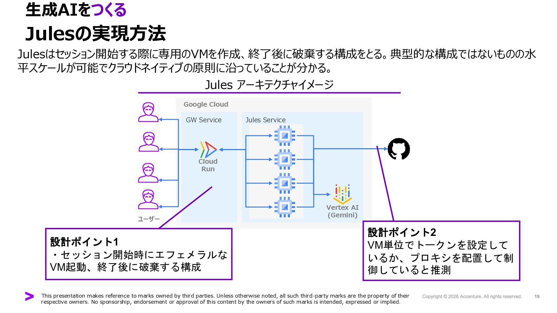 Cloud Run Jules Service Jules アーキテクチャイメージ 設計ポイント1 ・セッション開始時にエフェメラルな VM起動、終了後に破棄する構成 設計ポイント2 VM単位でトークンを設定して いるか、プロキシを配置して制 御していると推測 This presentation makes reference to marks owned by third parties. Unless otherwise noted, all such third-party marks are the property of their respective owners. No sponsorship, endorsement or approval of this content by the owners of such marks is intended, expressed or implied. Google Cloud