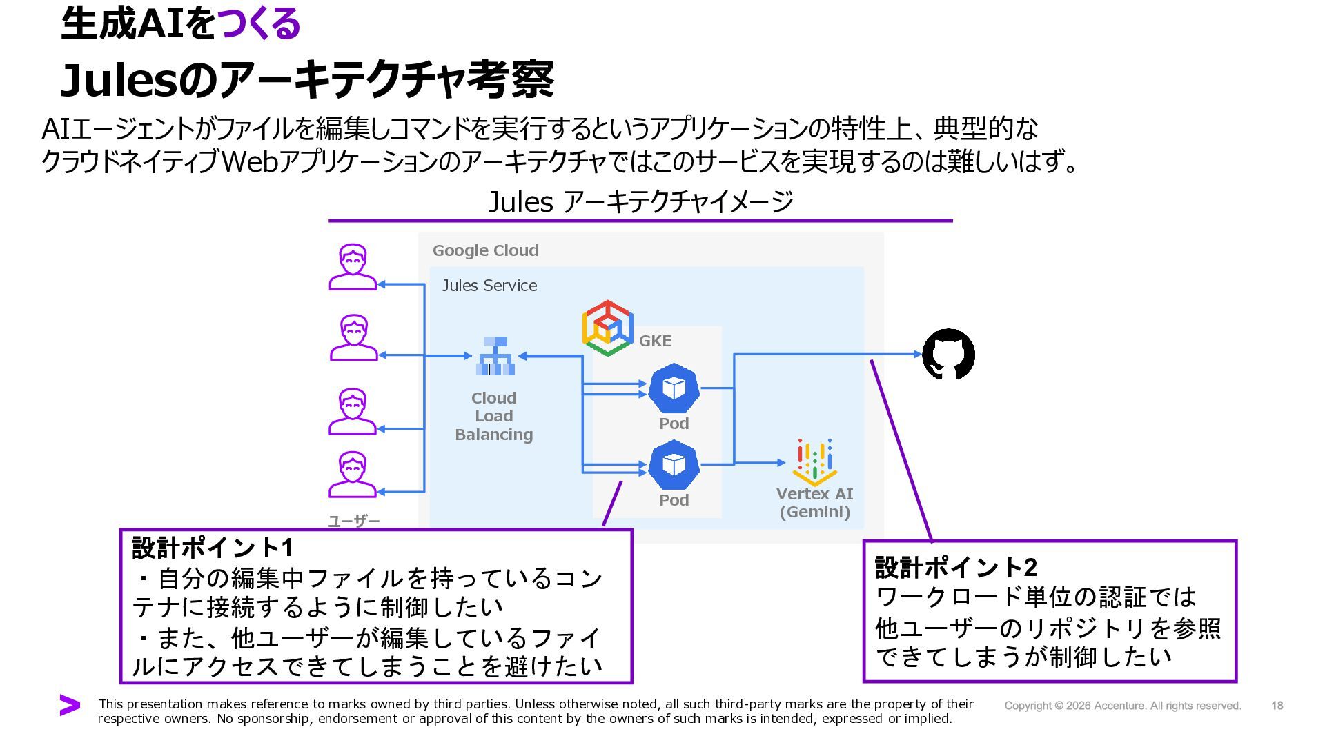 ユーザー Pod Pod Vertex AI (Gemini) Jules アーキテクチャイメージ 設計ポイント2 ワークロード単位の認証では 他ユーザーのリポジトリを参照 できてしまうが制御したい 設計ポイント1 ・自分の編集中ファイルを持っているコン テナに接続するように制御したい ・また、他ユーザーが編集しているファイ ルにアクセスできてしまうことを避けたい This presentation makes reference to marks owned by third parties. Unless otherwise noted, all such third-party marks are the property of their respective owners. No sponsorship, endorsement or approval of this content by the owners of such marks is intended, expressed or implied. Google Cloud