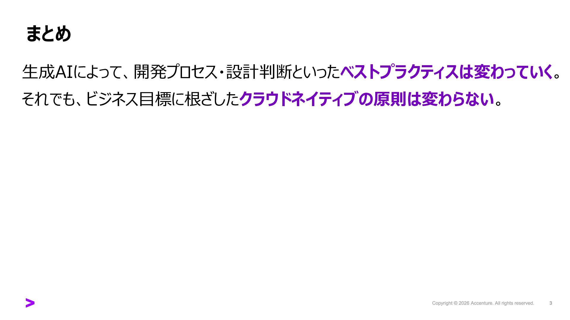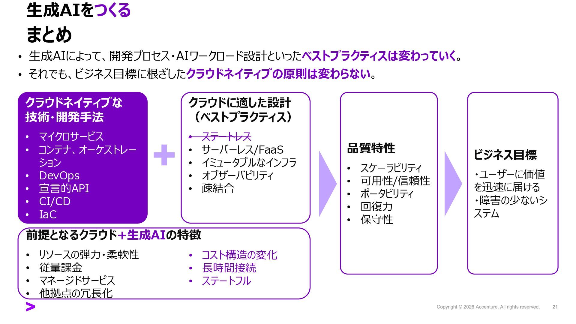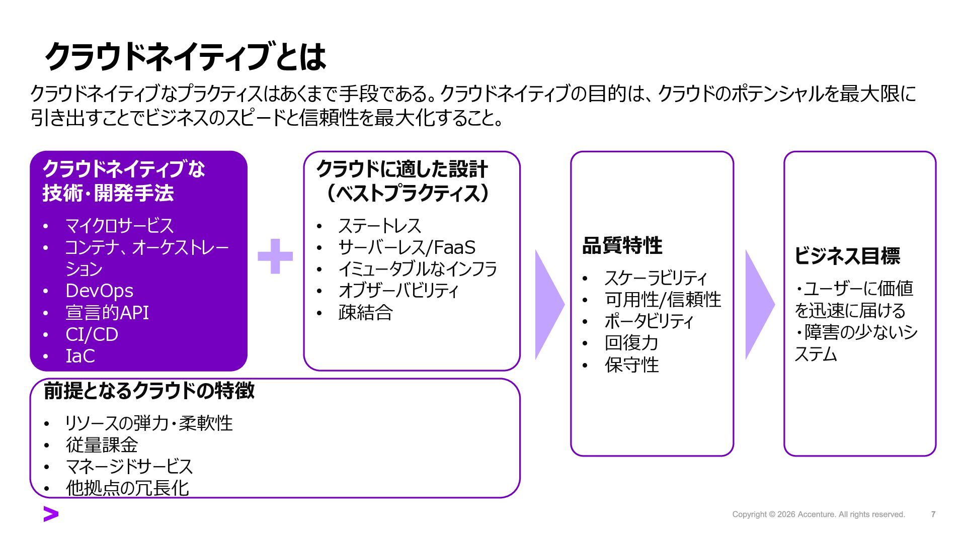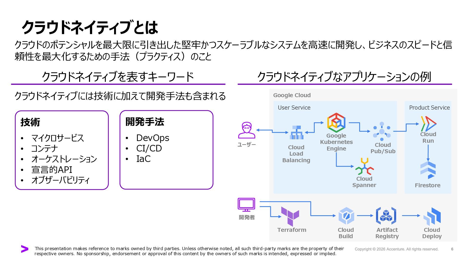 by third parties. Unless otherwise noted, all such third-party marks are the property of their respective owners. No sponsorship, endorsement or approval of this content by the owners of such marks is intended, expressed or implied. User Service Cloud Load Balancing Cloud Pub/Sub クラウドネイティブなアプリケーションの例 Cloud Run Google Kubernetes Engine Cloud Spanner Product Service Firestore 技術 • マイクロサービス • コンテナ • オーケストレーション • 宣言的API • オブザーバビリティ 開発手法 • DevOps • CI/CD • IaC クラウドネイティブを表すキーワード ユーザー 開発者 Cloud Build Artifact Registry Cloud Deploy Terraform クラウドネイティブには技術に加えて開発手法も含まれる Google Cloud