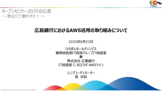 オープンセミナー2025@広島 広島銀行におけるAWS活用の取り組みについて 2025年8月23日 ひろぎんホールディングス 業務統括部IT統括グループIT統括室 兼 株式会社 広島銀行 IT統括部 C-BIZラボ