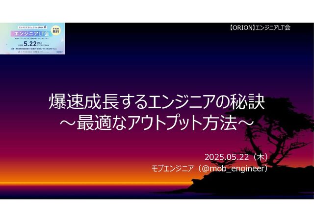 爆速成⾧するエンジニアの秘訣 ~最適なアウトプット方法~ 2025.05.22(木) モブエンジニア(@mob_engineer) 【ORION】エンジニアLT会