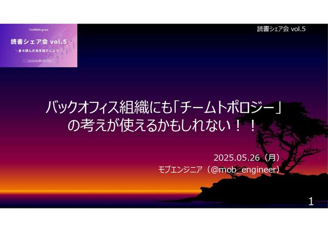 バックオフィス組織にも「チームトポロジー」 の考えが使えるかもしれない!! 2025.05.26(月) モブエンジニア(@mob_engineer) 読書シェア会 vol.5 1