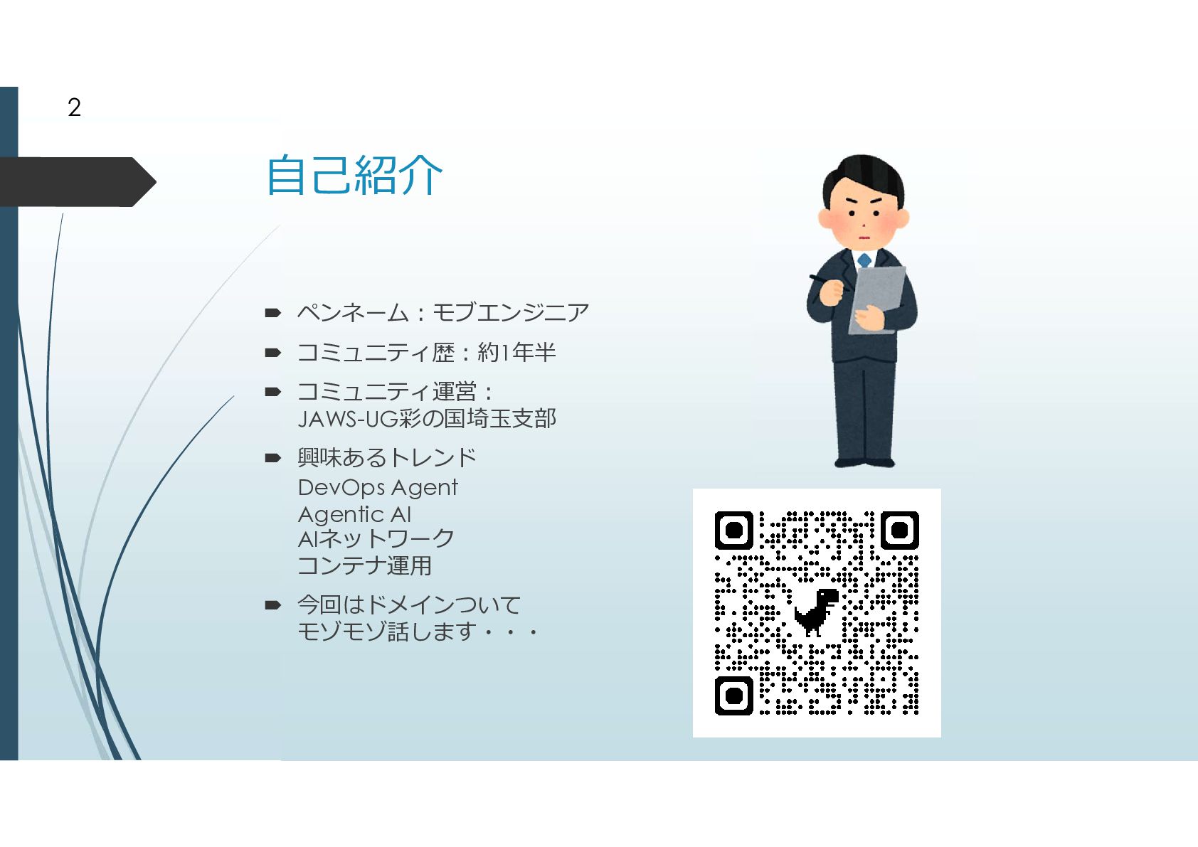 1. 自己紹介  ペンネーム:モブエンジニア  コミュニティ歴:約1年半  コミュニティ運営: JAWS-UG彩の国埼玉支部  興味あるトレンド