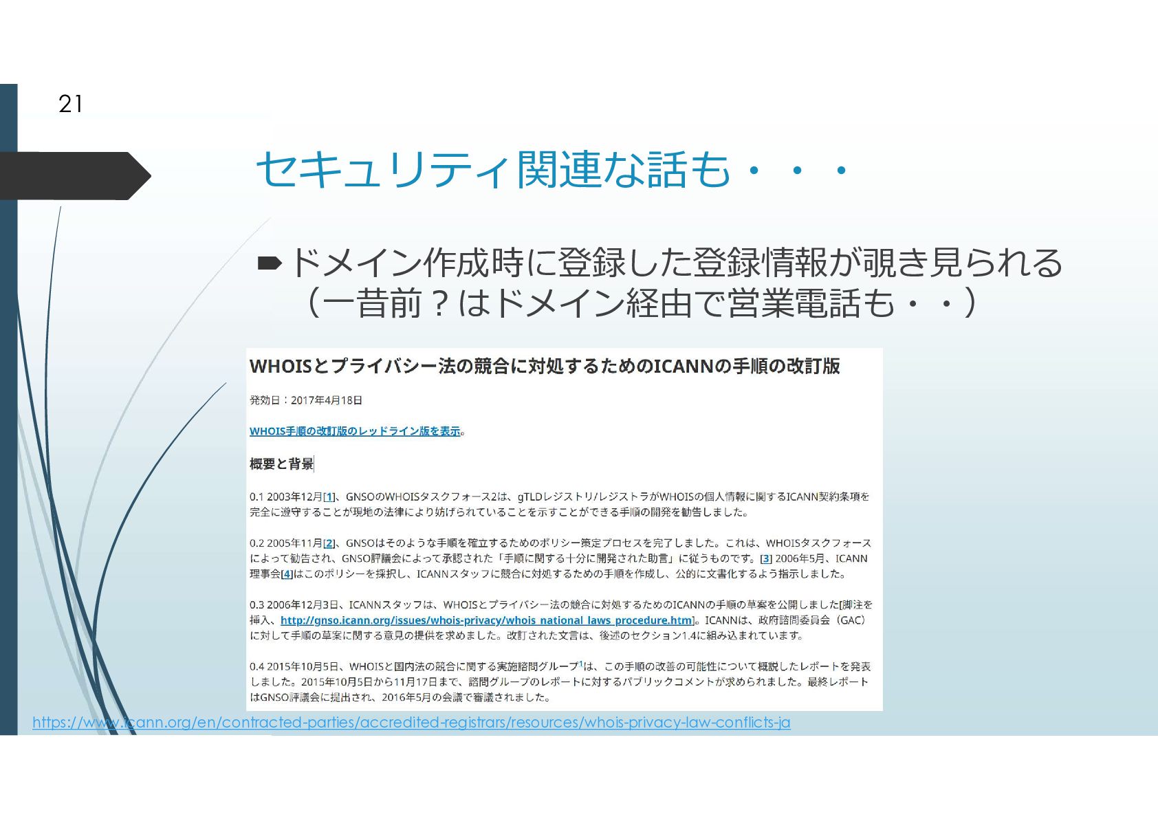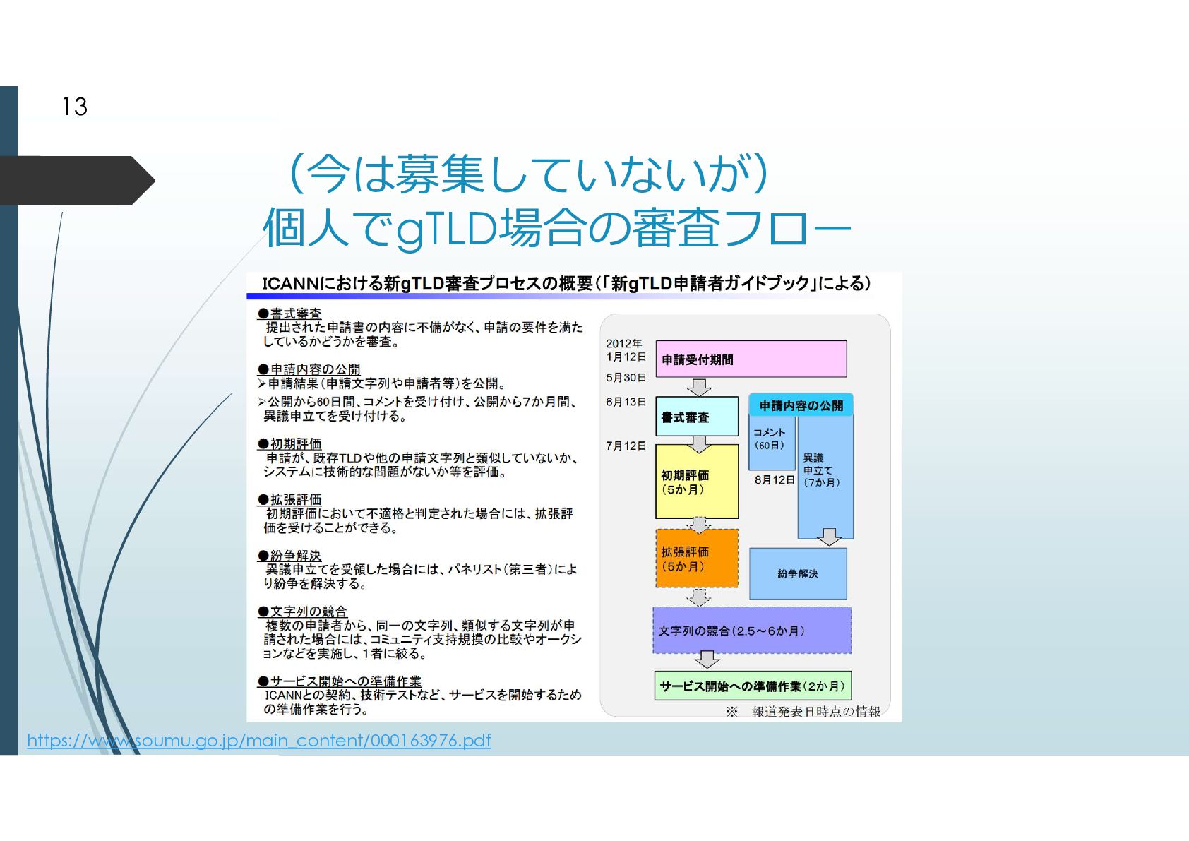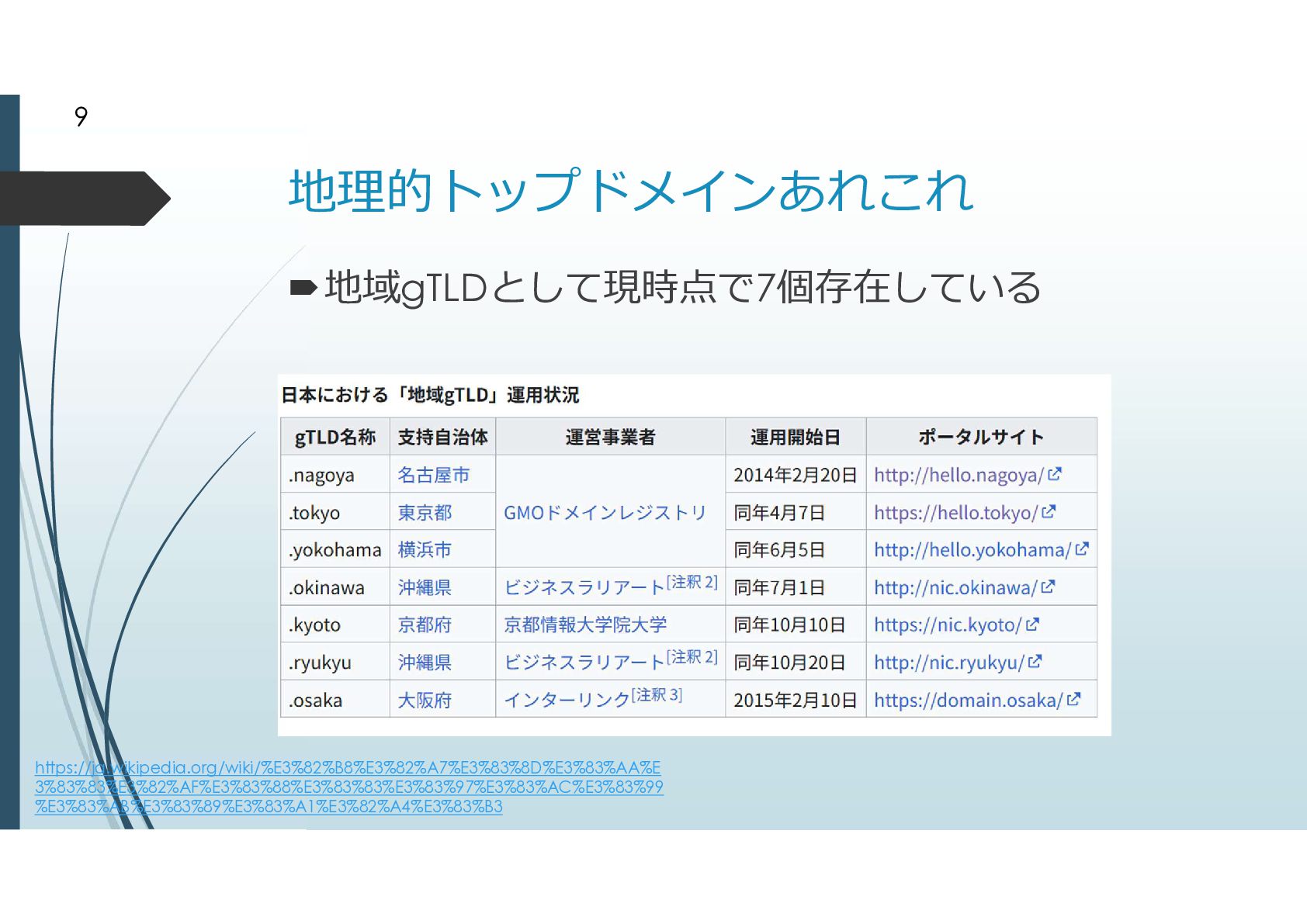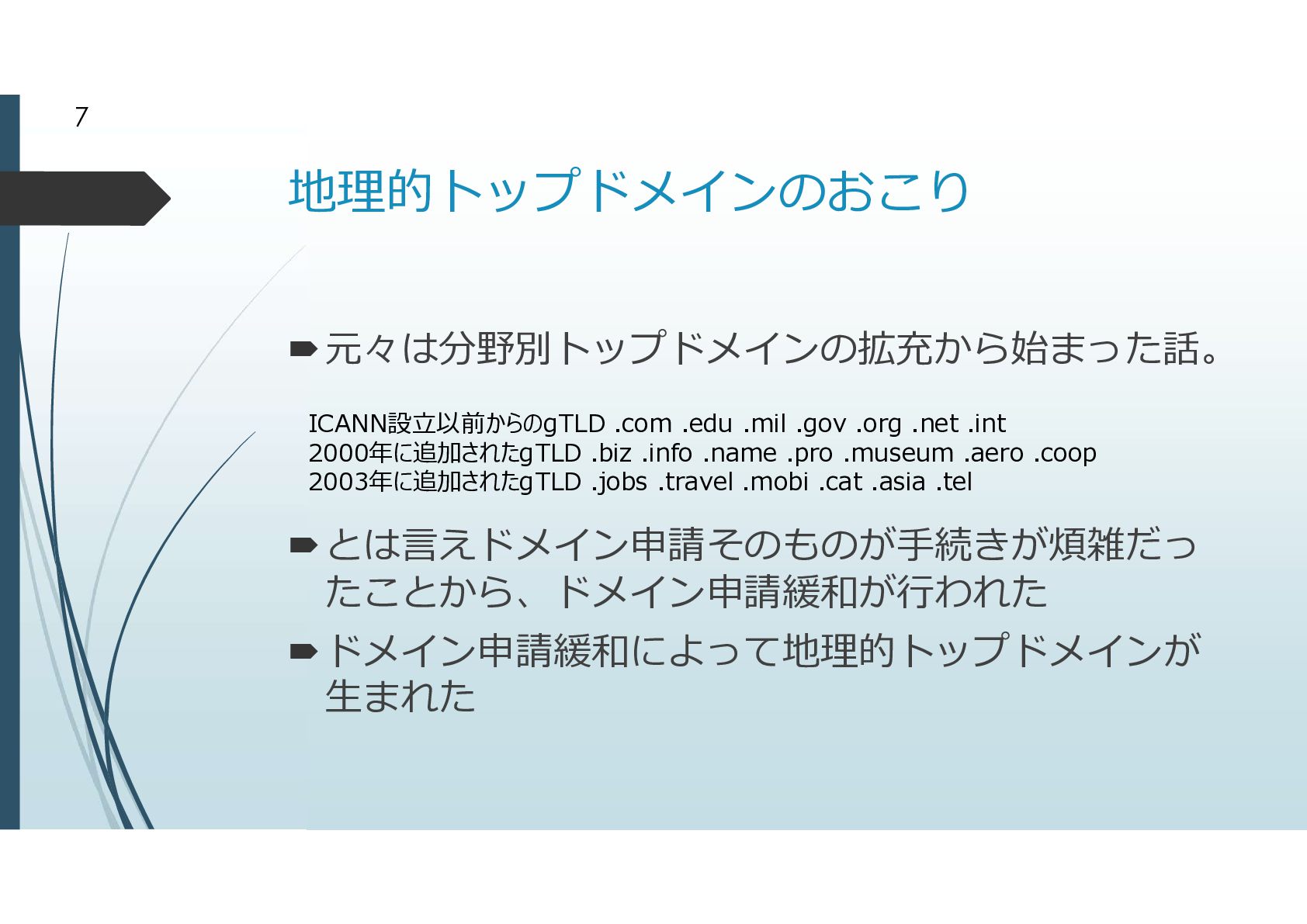 2000年に追加されたgTLD .biz .info .name .pro .museum .aero .coop 2003年に追加されたgTLD .jobs .travel .mobi .cat .asia .tel とは言えドメイン申請そのものが手続きが煩雑だっ たことから、ドメイン申請緩和が行われた ドメイン申請緩和によって地理的トップドメインが 生まれた 8