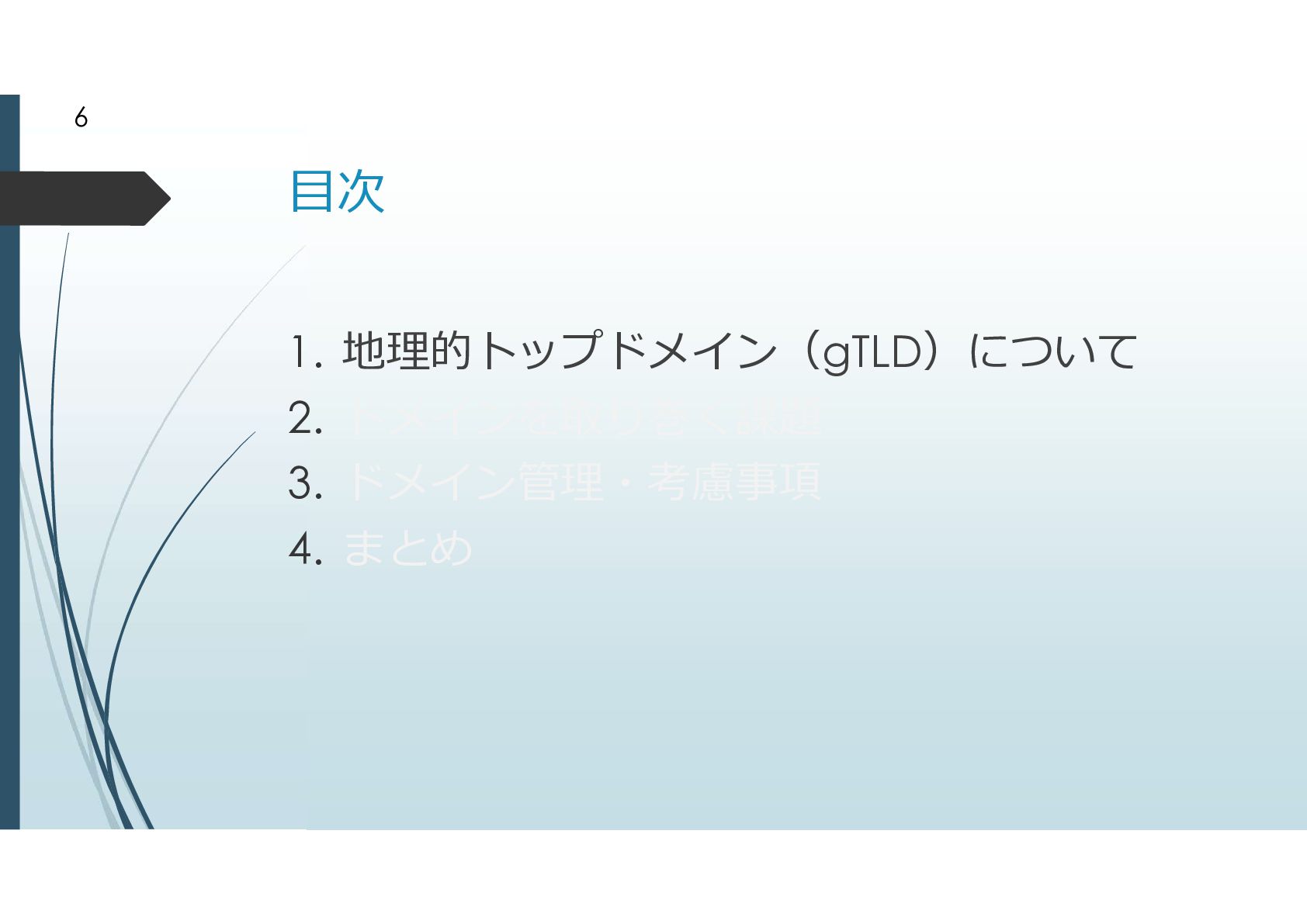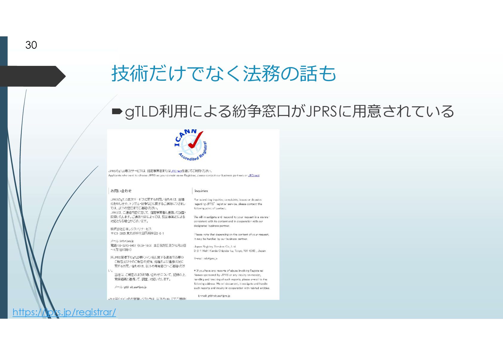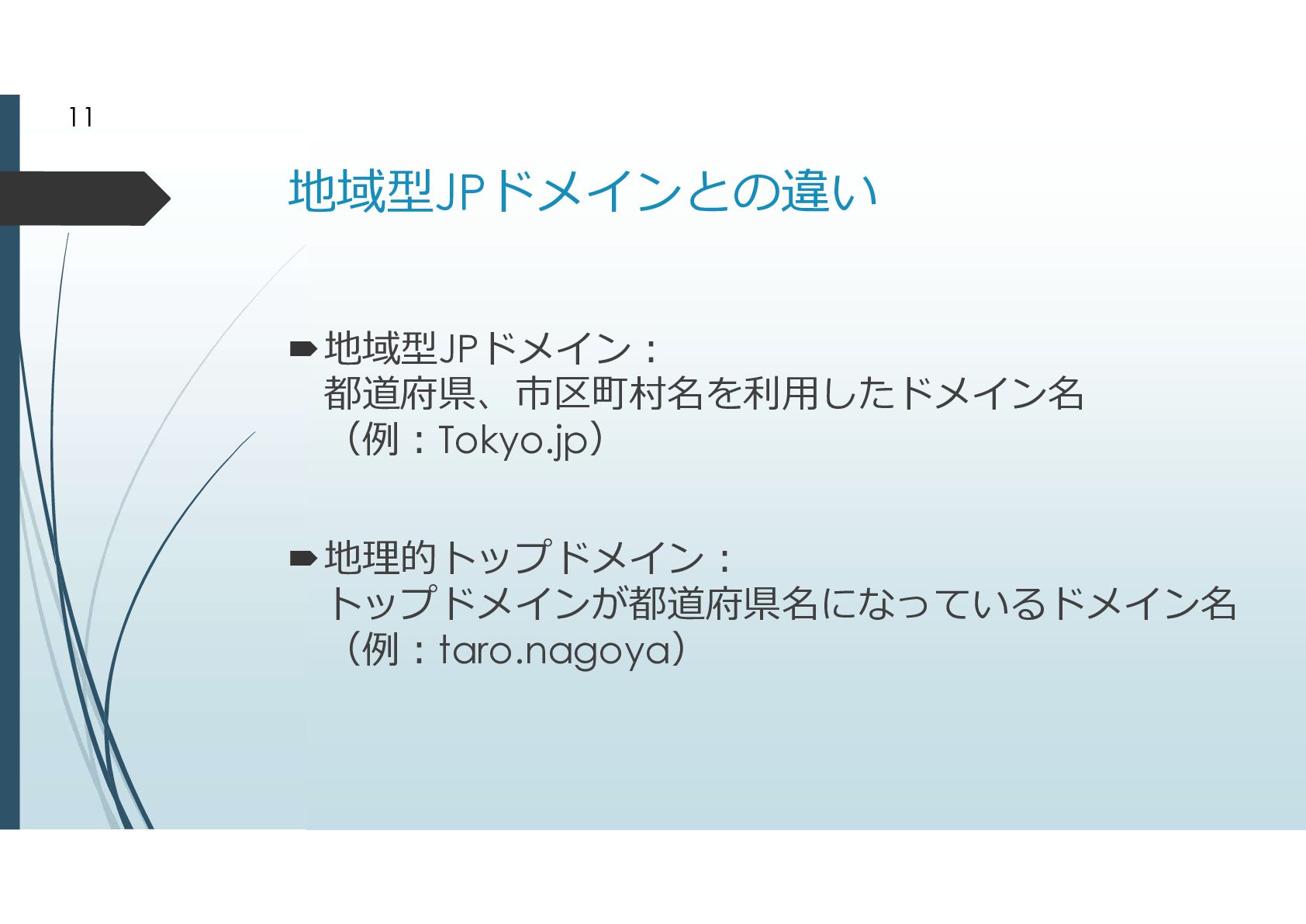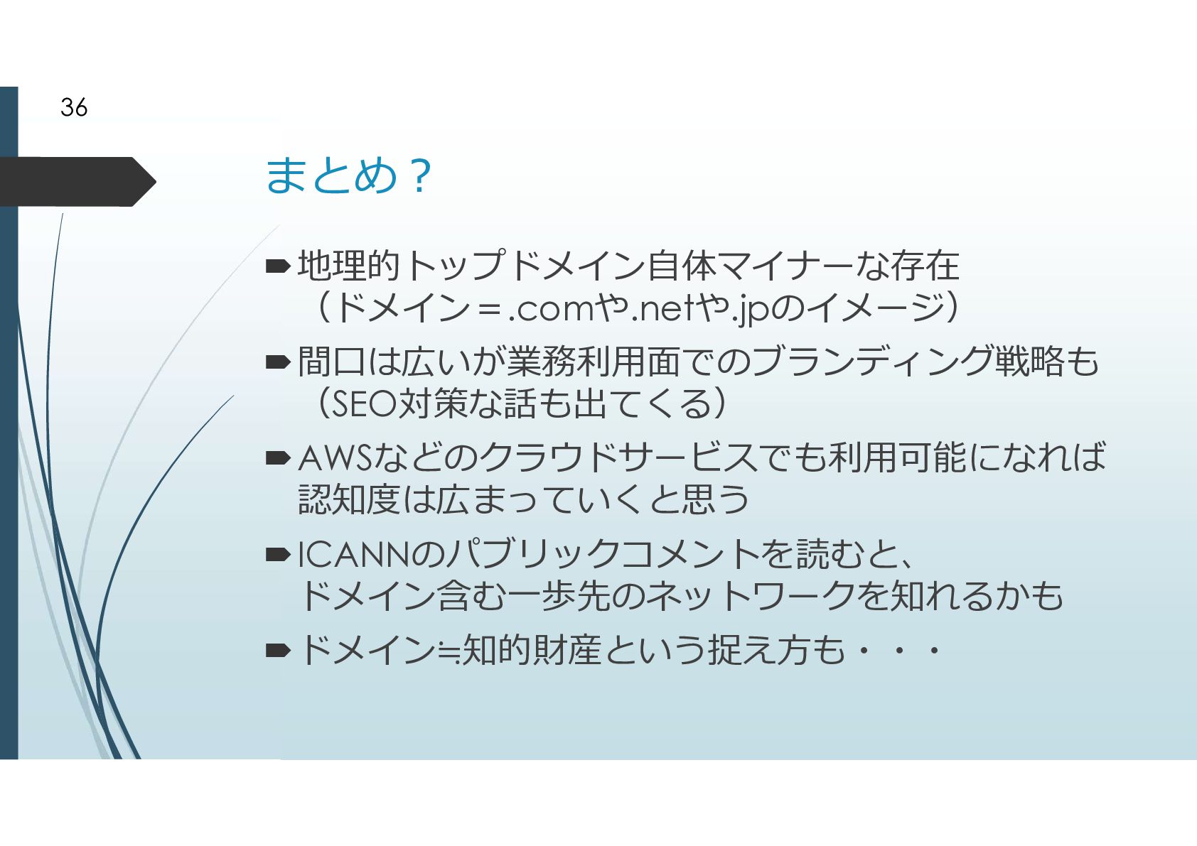2000年に追加されたgTLD .biz .info .name .pro .museum .aero .coop 2003年に追加されたgTLD .jobs .travel .mobi .cat .asia .tel とは言えドメイン申請そのものが手続きが煩雑だっ たことから、ドメイン申請緩和が行われた ドメイン申請緩和によって地理的トップドメインが 生まれた 8