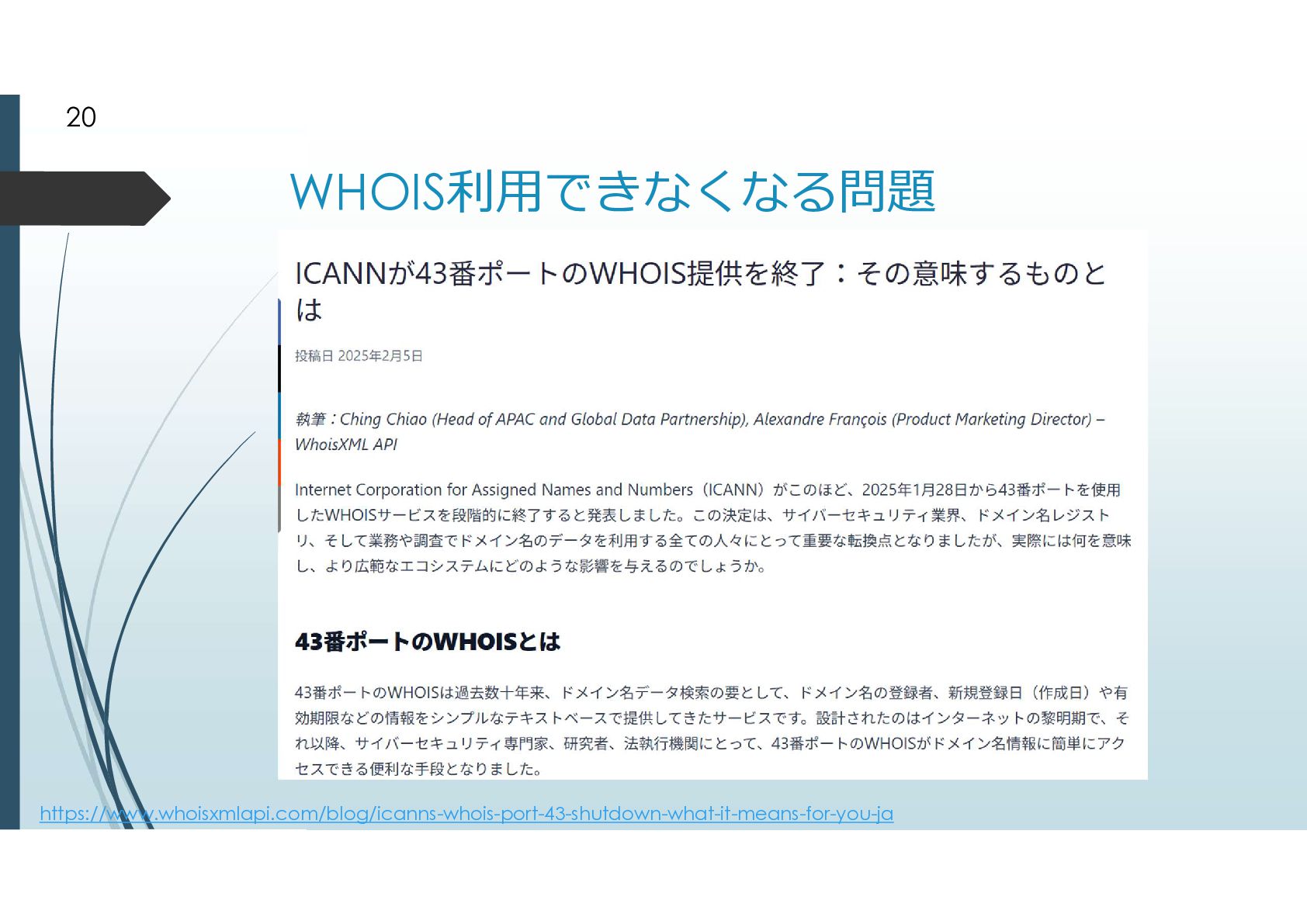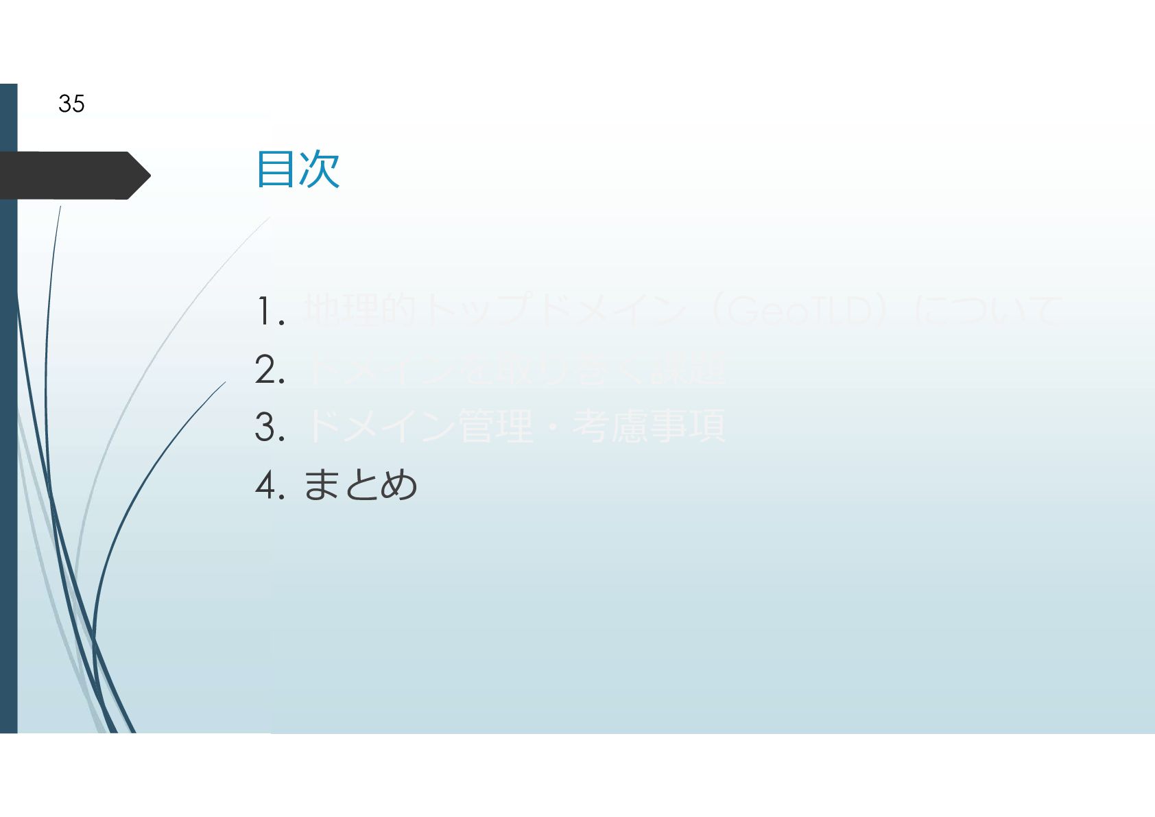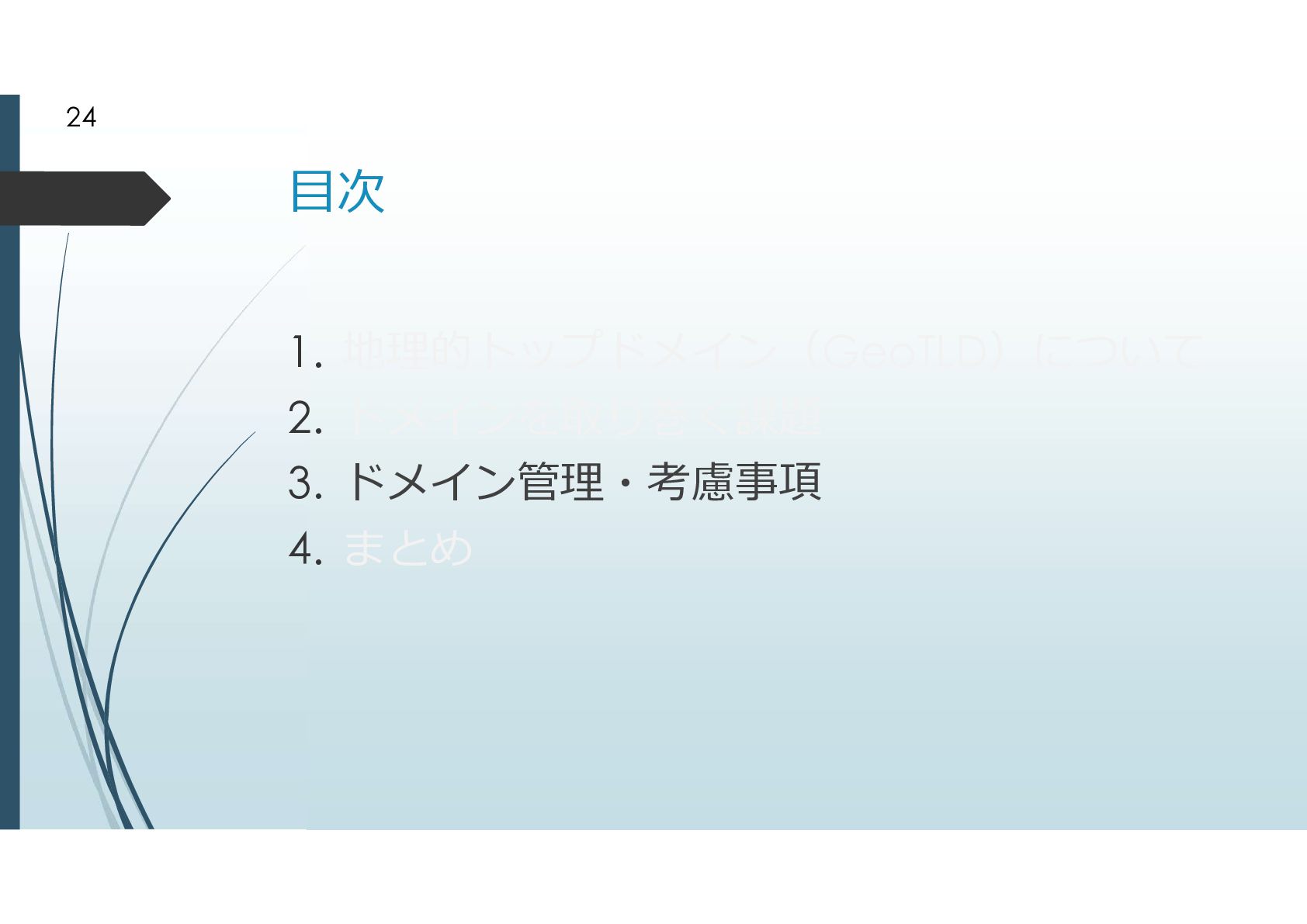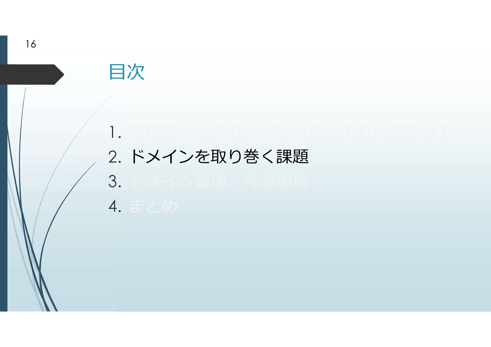 2000年に追加されたgTLD .biz .info .name .pro .museum .aero .coop 2003年に追加されたgTLD .jobs .travel .mobi .cat .asia .tel とは言えドメイン申請そのものが手続きが煩雑だっ たことから、ドメイン申請緩和が行われた ドメイン申請緩和によって地理的トップドメインが 生まれた 8