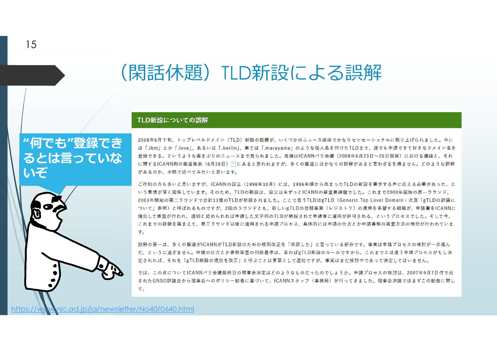 2. 地理的トップドメインのおこり 元々は分野別トップドメインの拡充から始まった話。 ICANN設立以前からのgTLD .com .edu .mil .gov .org .net .int