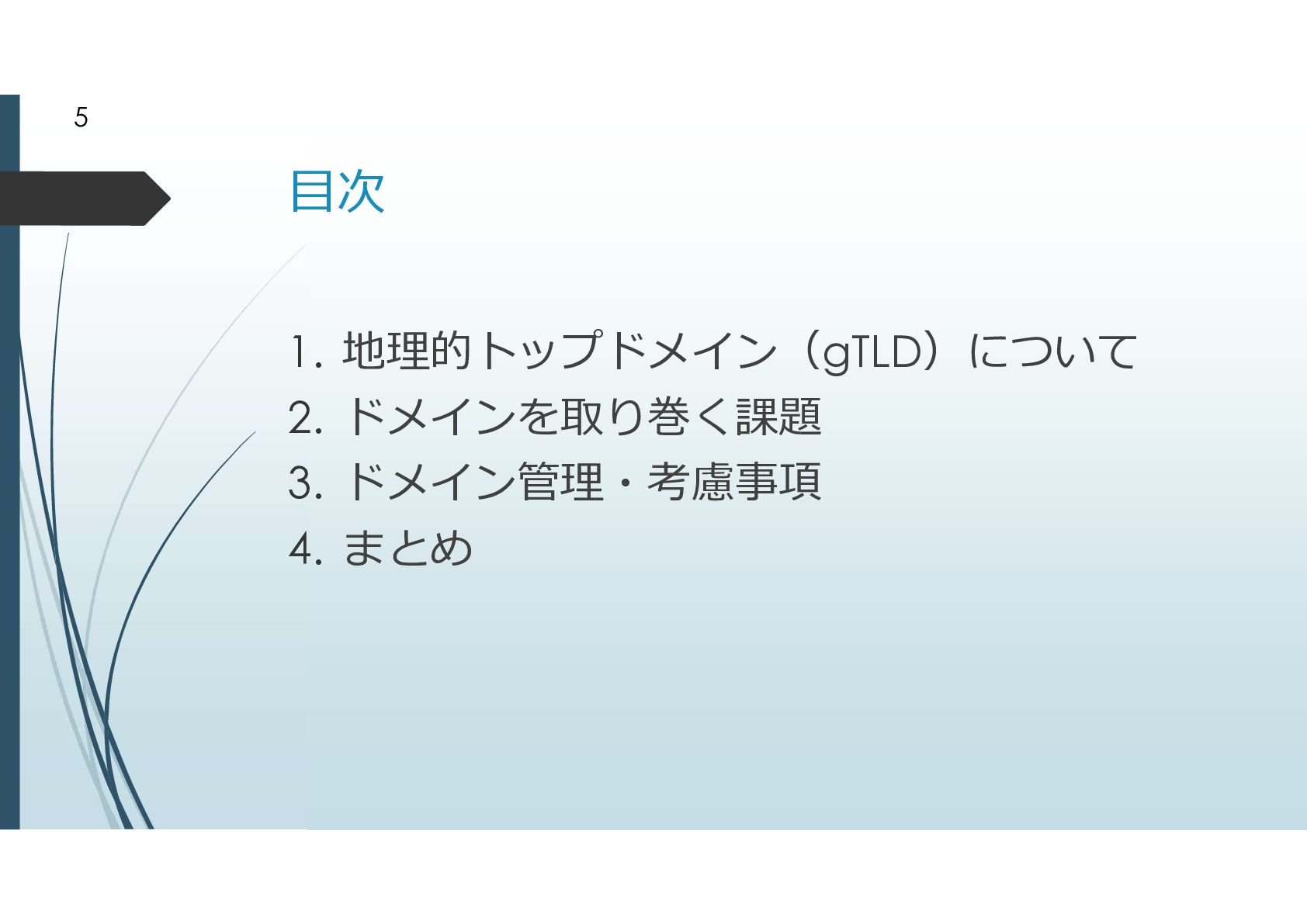 3. 地理的トップドメインのおこり 元々は分野別トップドメインの拡充から始まった話。 ICANN設立以前からのgTLD .com .edu .mil .gov .org .net .int