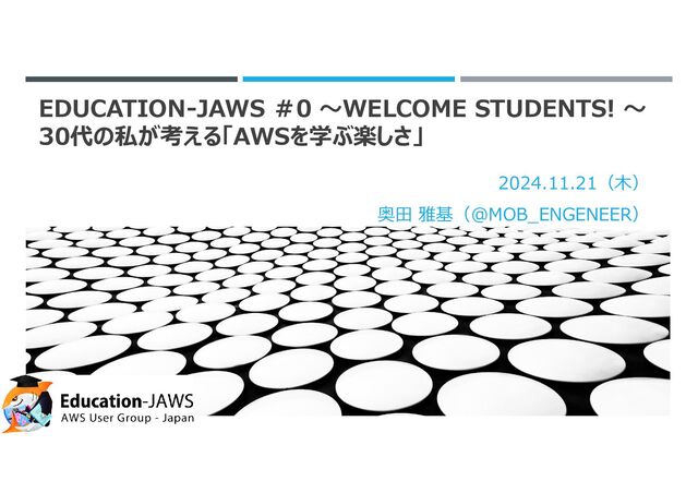 11/21 Education Jaws発表資料となります。 不定期ですが、私のQiitaブログでAWSに関する技術紹介・ハンズオン記事を紹介しております。 https://qiita.com/MASAKIOKUDA-eng