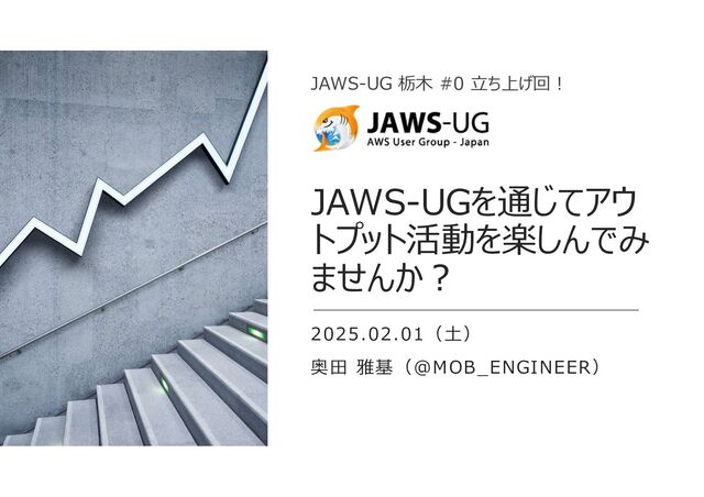 JAWS-UGを通じてアウ トプット活動を楽しんでみ ませんか? 2025.02.01(土) 奥田 雅基(@MOB_ENGINEER) JAWS-UG 栃木 #0 立ち上げ回!