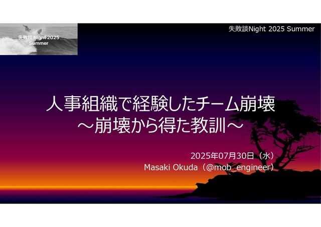 人事組織で経験したチーム崩壊 ~崩壊から得た教訓~ 2025年07月30日(水) Masaki Okuda(@mob_engineer) 失敗談Night 2025 Summer
