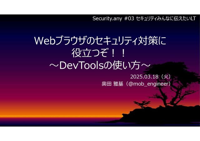 Webブラウザのセキュリティ対策に 役立つぞ!! ~DevToolsの使い方~ 2025.03.18(火) 奥田 雅基(@mob_engineer) Security.any #03 セキュリティみんなに伝えたいLT