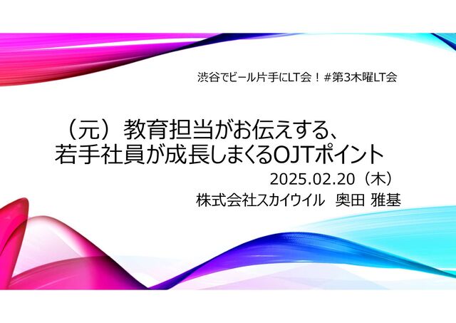 (元)教育担当がお伝えする、 若手社員が成⾧しまくるOJTポイント 2025.02.20(木) 株式会社スカイウイル 奥田 雅基 渋谷でビール片手にLT会!#第3木曜LT会