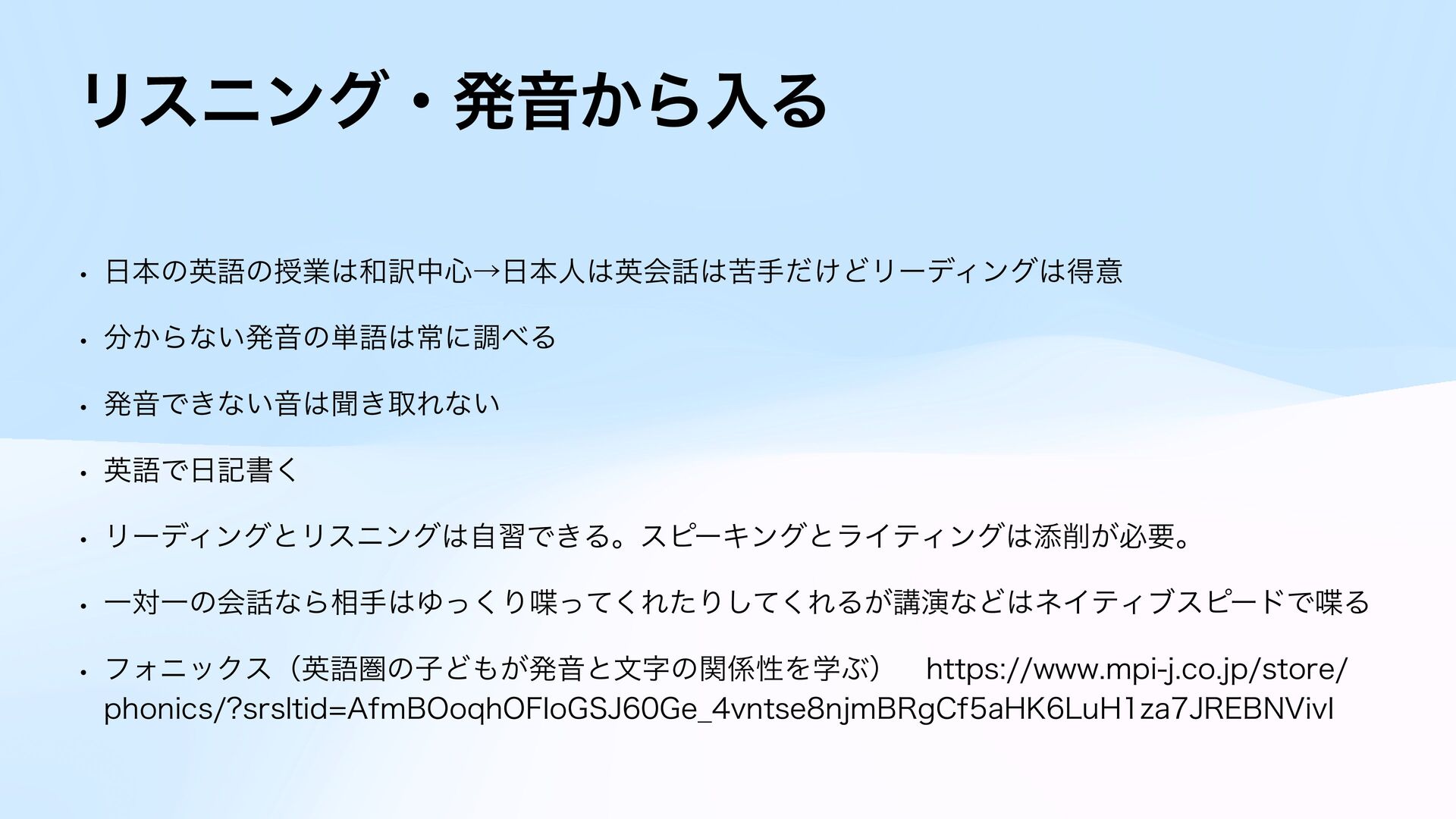 ϦʔσΟϯάͱϦεχϯάࣗशͰ͖ΔɻεϐʔΩϯάͱϥΠςΟϯάఴ͕ඞཁɻ w ҰରҰͷձͳΒ૬खΏͬ͘Γͬͯ͘ΕͨΓͯ͘͠ΕΔ͕ߨԋͳͲωΠςΟϒεϐʔυͰΔ w ϑΥχοΫεʢӳޠݍͷࢠͲ͕ൃԻͱจࣈͷؔੑΛֶͿʣɹIUUQTXXXNQJKDPKQTUPSF QIPOJDT TSTMUJE"GN#0PRI0'*P(4+(F@WOUTFOKN#3H$GB),-V)[B+3&#/7JW*